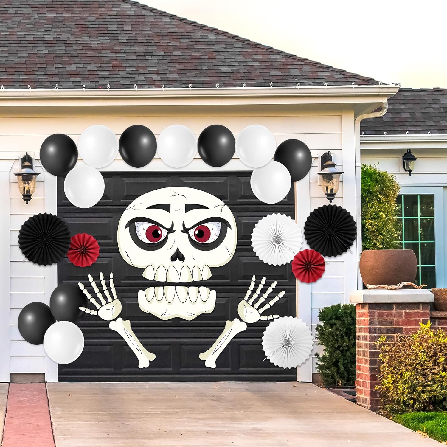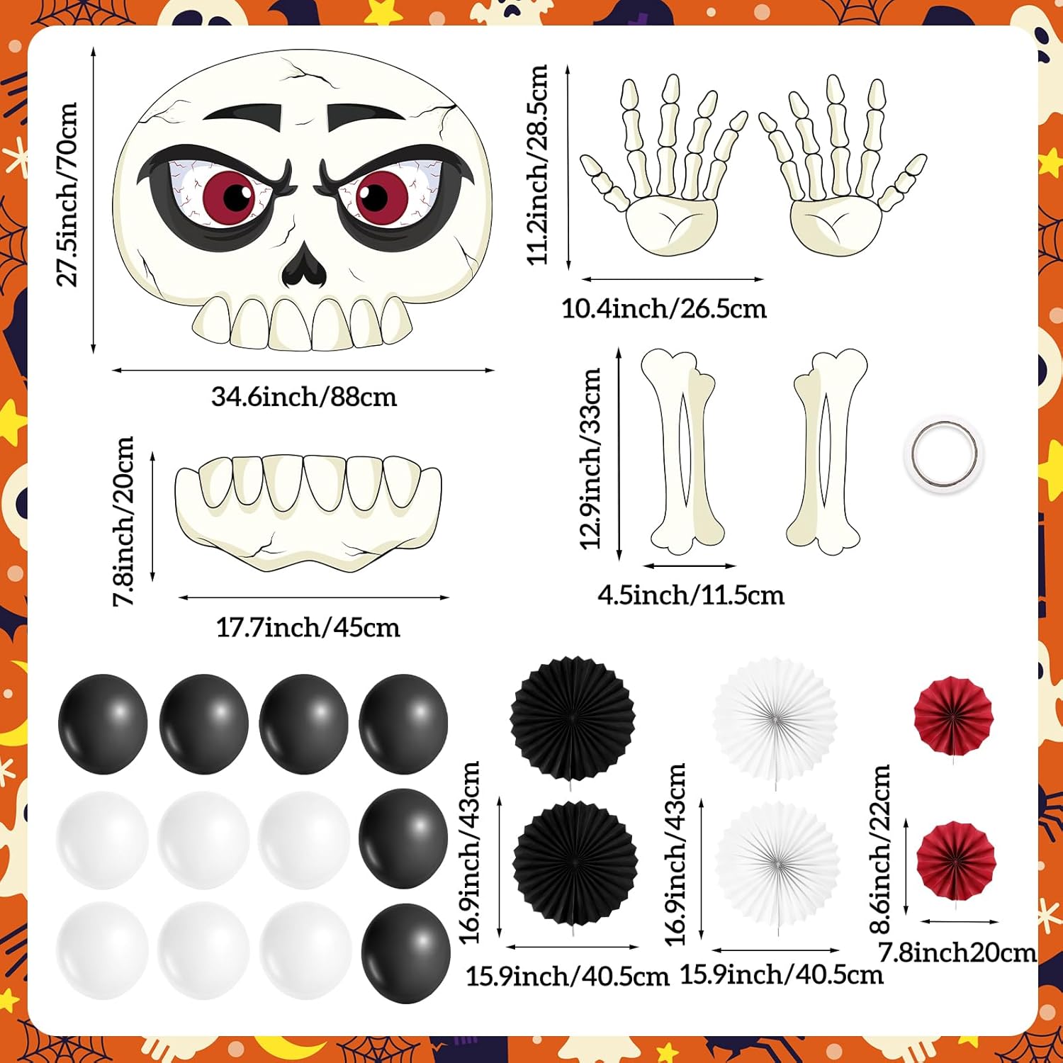 Package Includes: 6 skeleton boards, 12 balloons (6 black, 6 white), 6 paper fans (2 black, 2 white, 2 red) and 1 rolls of double-sided tapes to make your Halloween trunk or treat car decorations more thematic and attractive