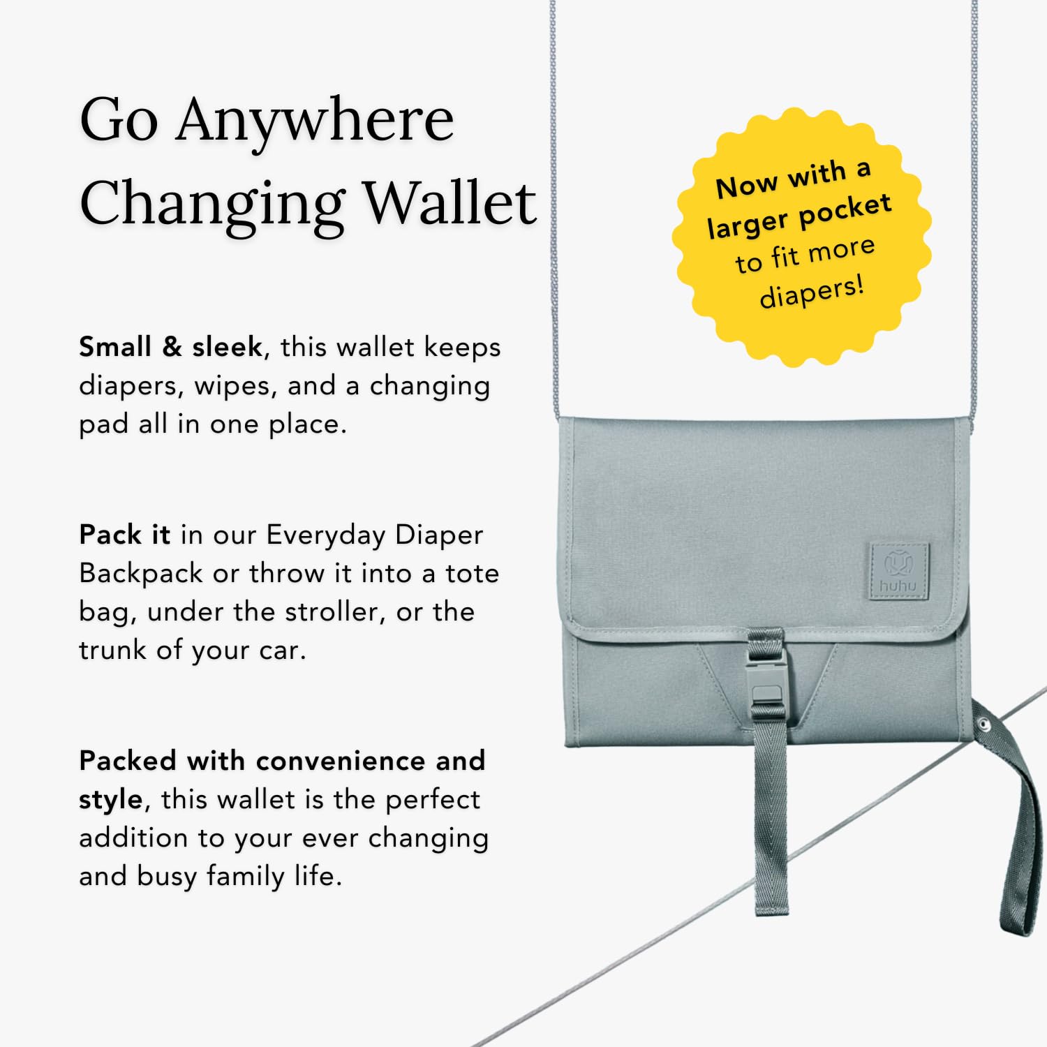 The Go Anywhere Changing Wallet includes a magnetic buckle for easy one-handed open and an adjustable strap to expand or compress the wallet based on your usage. Made with a premium durable exterior fabric, and an easy-to-wipe interior fabric, this product is designed to withstand years of use, all the way from the first size zero diaper through the potty training phase.