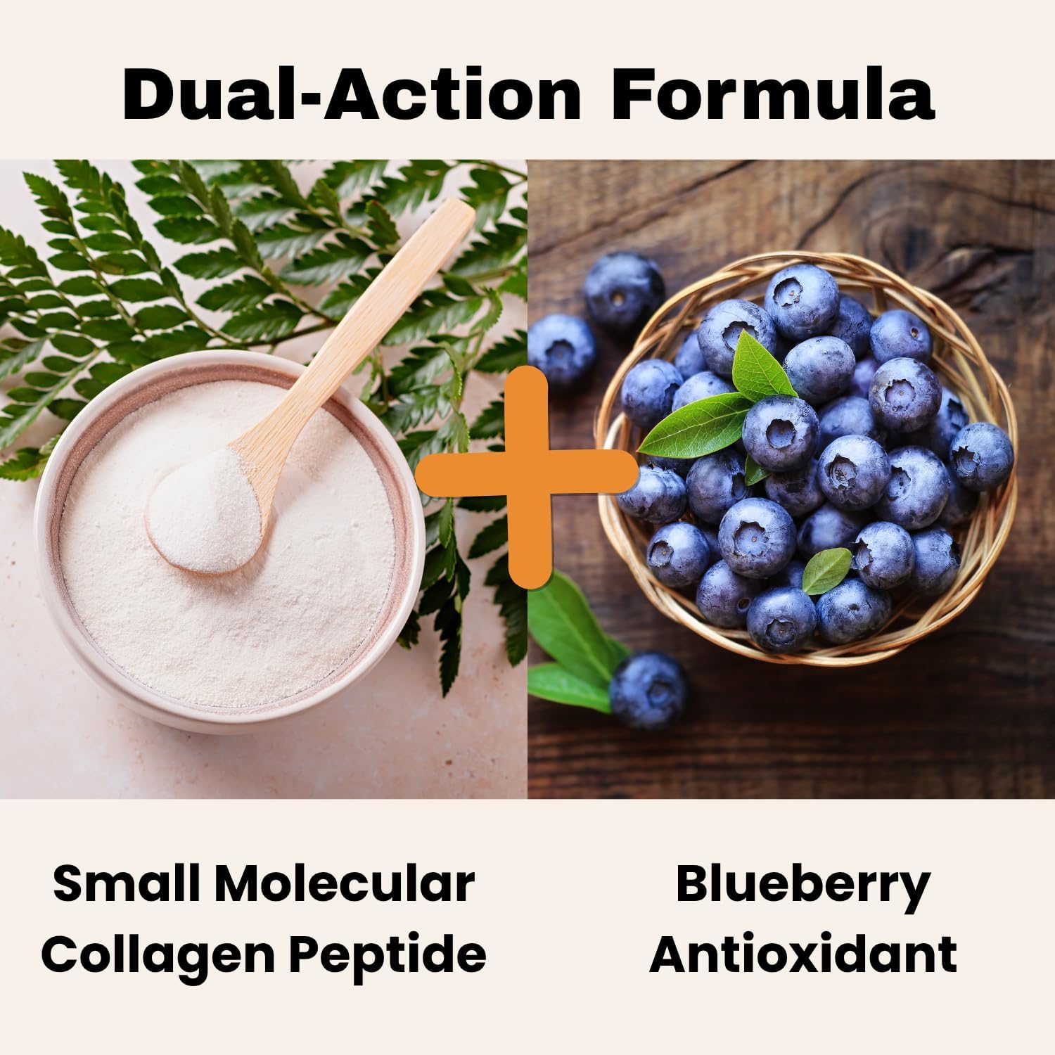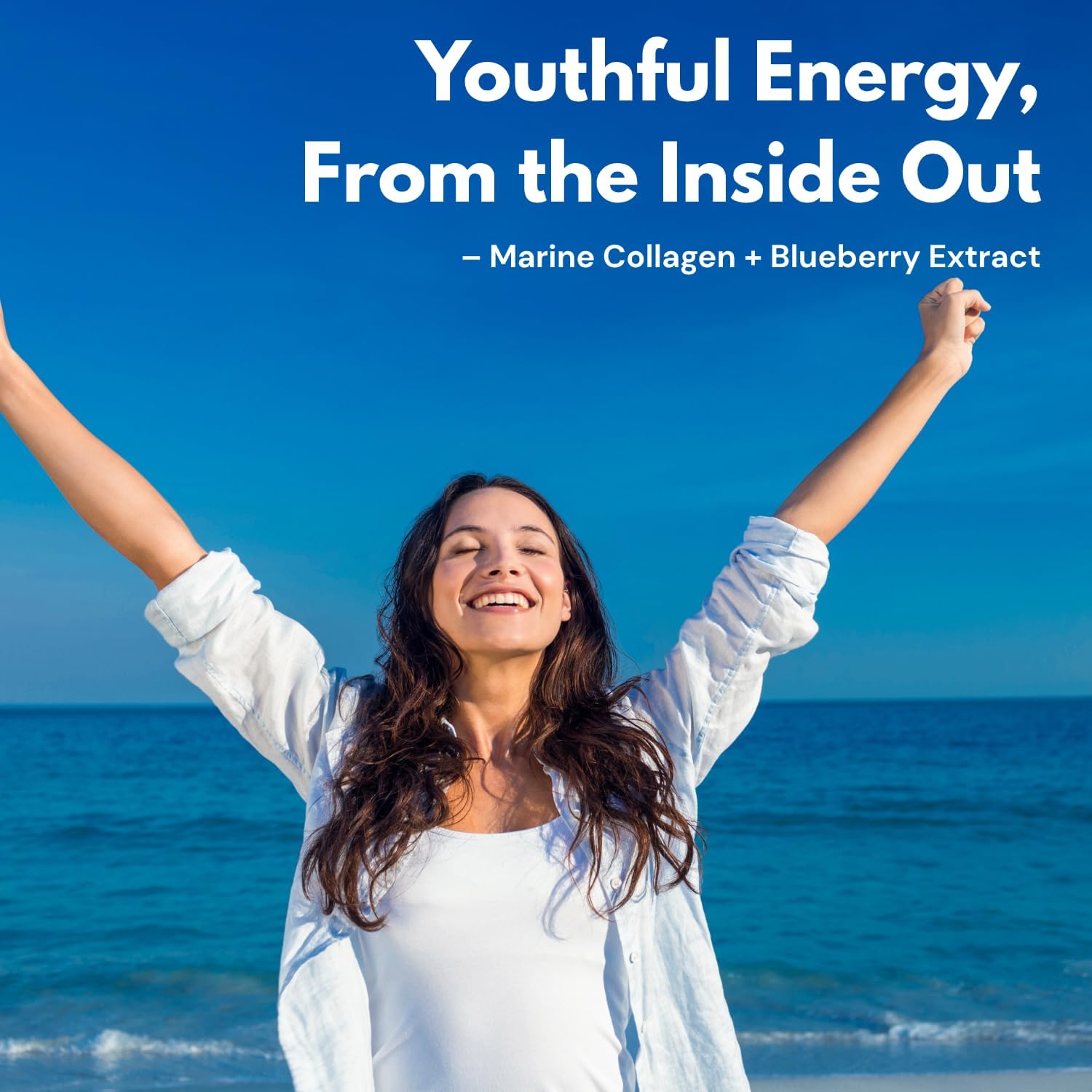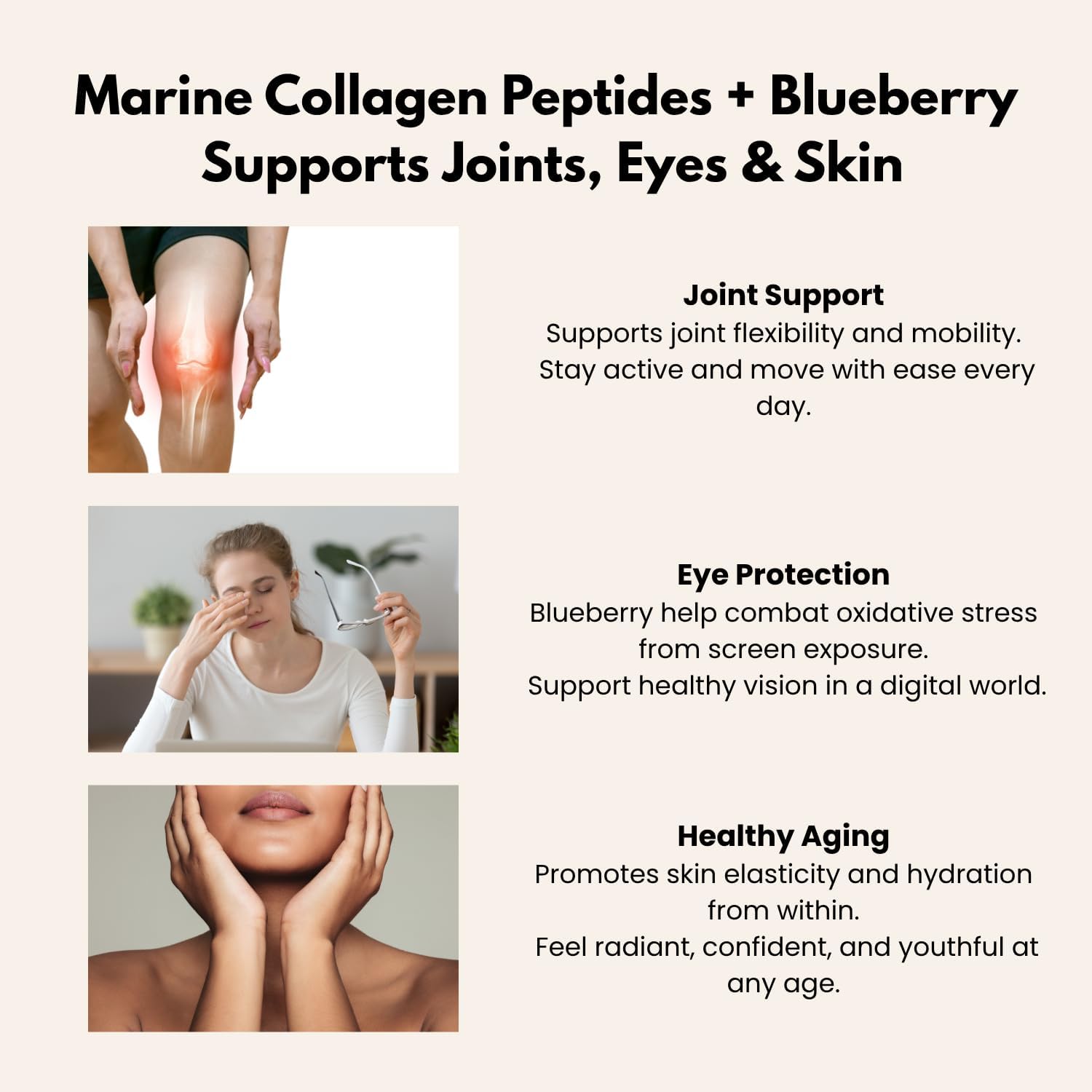 Marine Collagen + Blueberry for Whole-Body Support: This dual-action formula combines hydrolyzed marine collagen peptides with antioxidant-rich blueberry extract to support joint flexibility, skin elasticity, and eye health — all in one daily capsule.