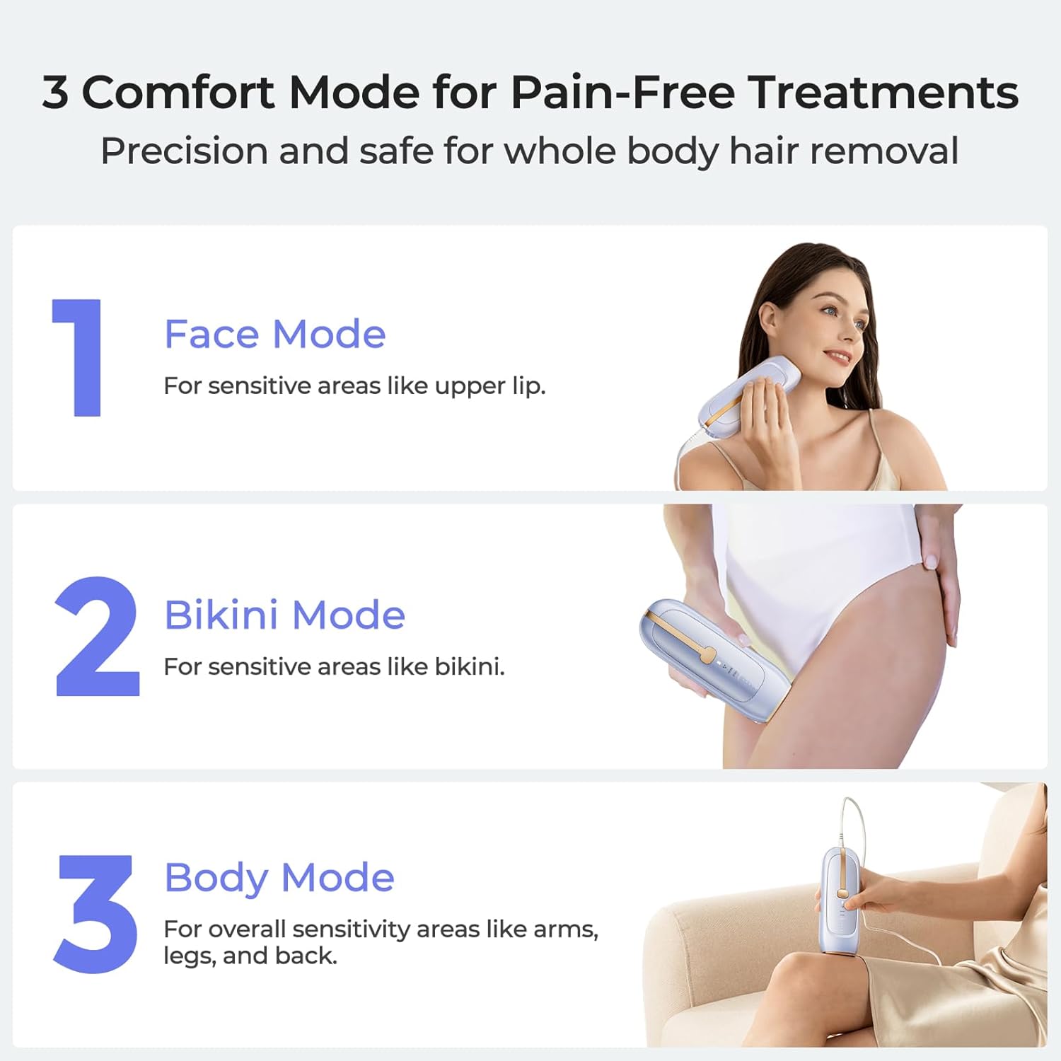 3 Modes & 15 Sensitive Levels: The IPL hair removal has 3 modes: “Body,” “Face,” and “Bikini,” each with 5 sensitivity levels, allowing you to perform precise body hair removal at home, like bikini, face, lip, arm, armpit, back, chest, leg, fingers, toes and so on. Only takes 8-10 minutes for the whole body painless treatments with automatic mode. Reveal silky-smooth skin with confidence at all time