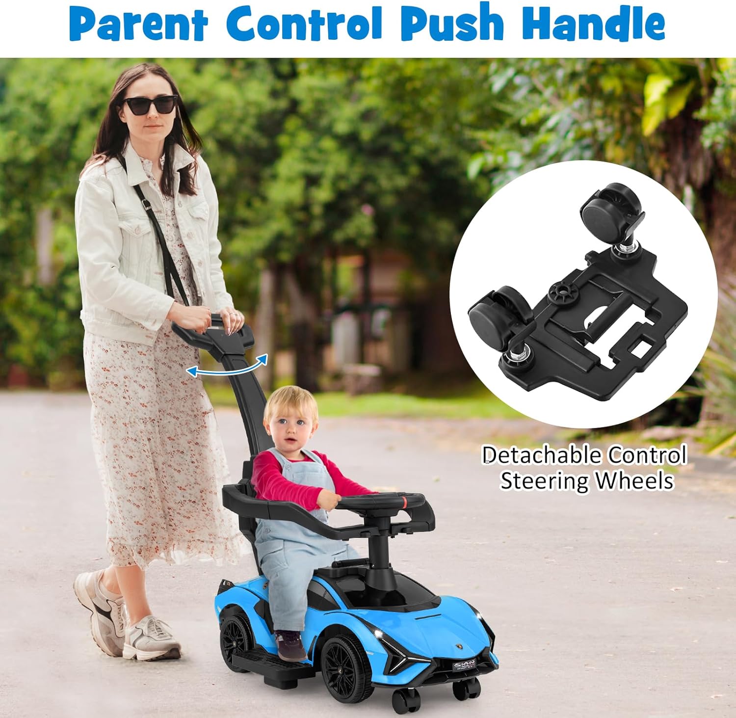 3-In-1 Convenient Push Car: The 3 in 1 car can be transformed into a stroller, walking Car, or riding on car, allowing it to grow with your child. The car has 2 control modes: parent control and child control. In addition, the detachable steering wheel is convenient for parent to control the direction.