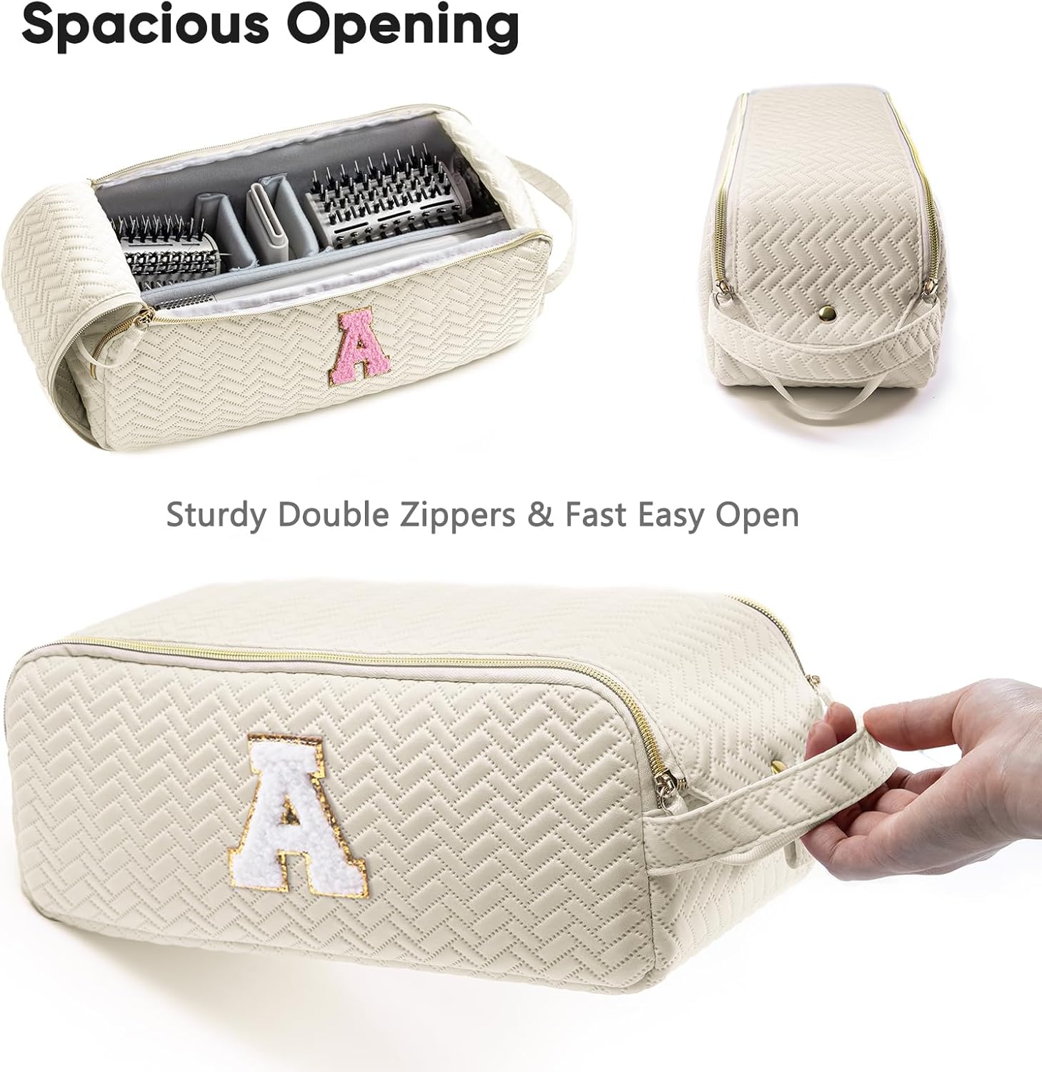 ✨ Personalized Initial Design: Stand out with a gold glitter chenille patch showcasing your chosen initial! Each hair travel bag also includes a bonus pink initial patch for fun DIY customization. A thoughtful and stylish gift for hairstylist or beauty lover. It’s a great salon organizer travel pouch, bathroom and travel essential.