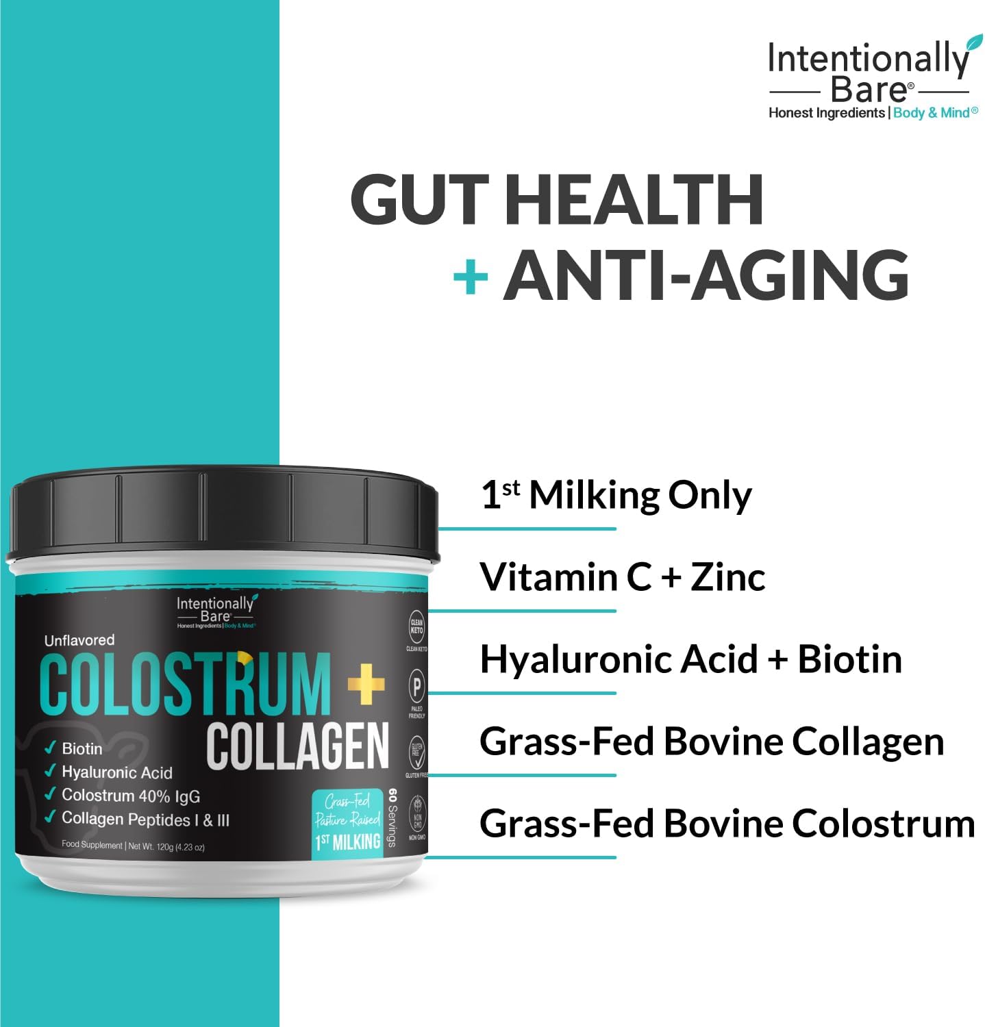 ADVANCED COLOSTRUM AND COLLAGEN POWDER – A powerful blend of grass-fed bovine colostrum and multi collagen peptides powder, designed to support skin hydration, joint flexibility, and gut health in one daily scoop.
