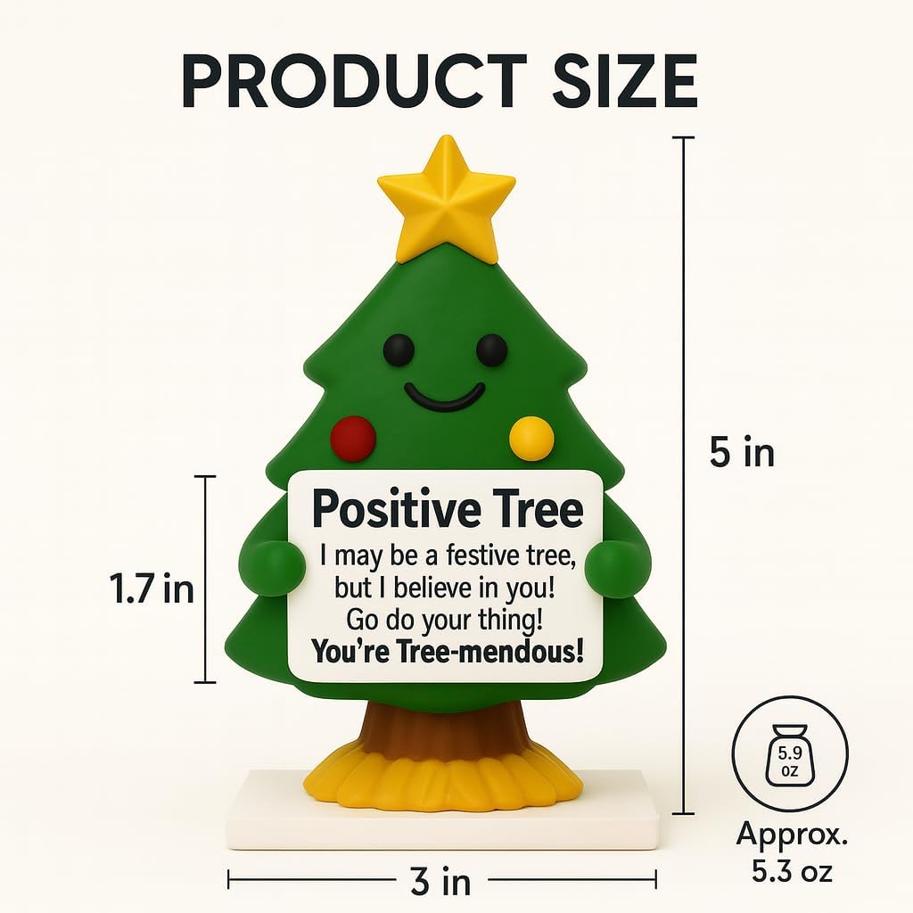 Mini Christmas Tree of Positivity: Brighten your workspace with this adorable mini Christmas tree figurine holding an inspirational sign. It measures 5” x 3”, making it the perfect Christmas decor for desk or shelf display without taking up too much room.