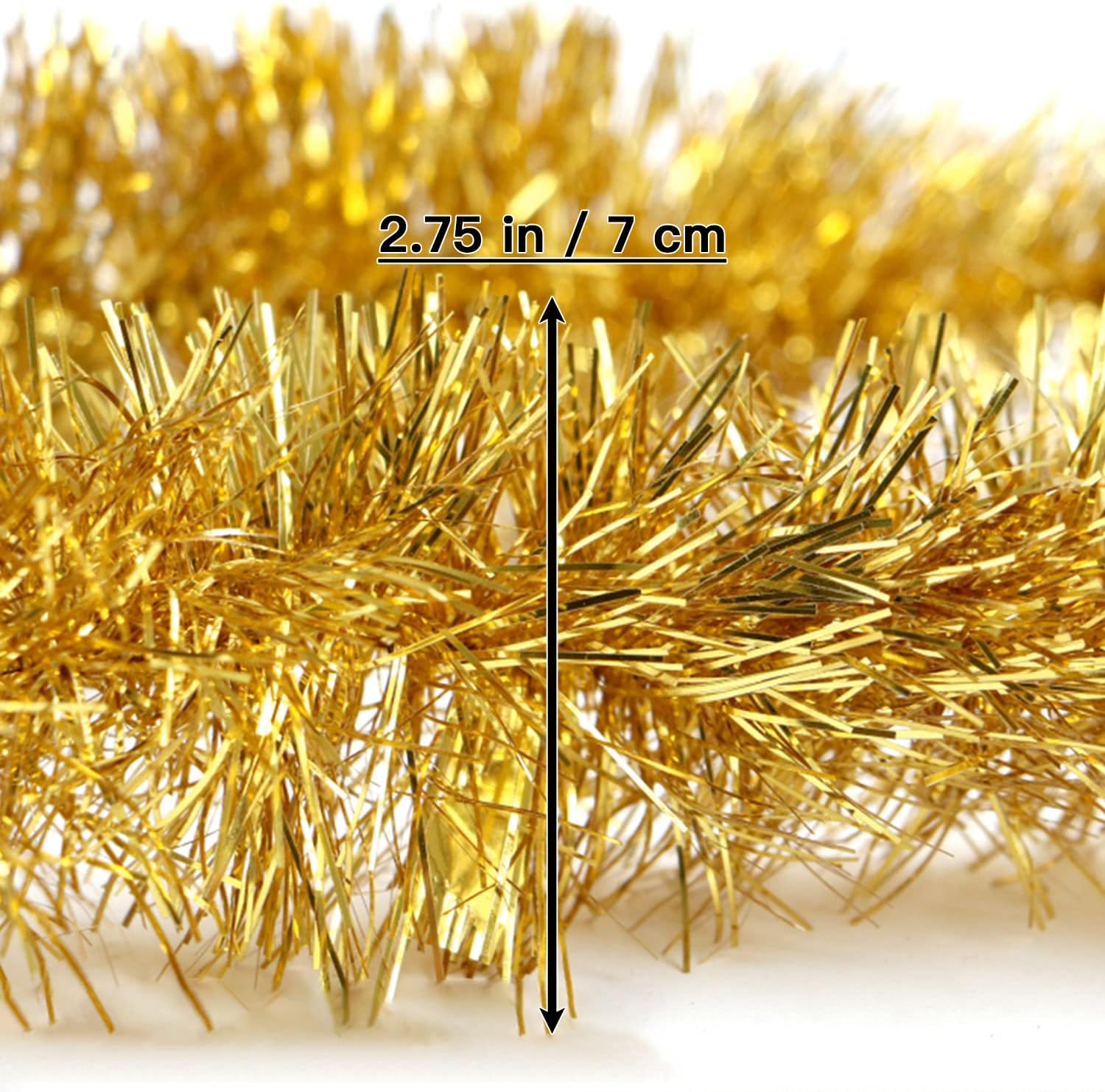 50FT VALUE PACK: Our artificial gold tinsel garland with premium foil fringe, 50 feet long x 2.8 inch/ 70mm wide, single strand. The beautiful fluffy gold tinsel garland can be used for both indoor home decor and decorative outdoor yard garden use.