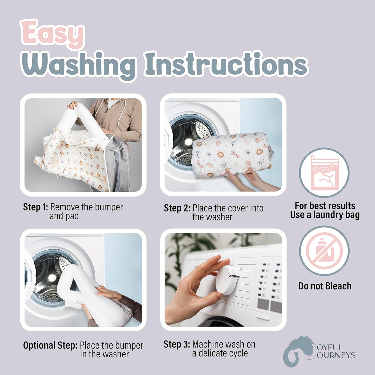 Effortless Cleanup for Busy Parents: Our baby snuggle nest is designed with your convenience in mind. Remove the pad and bumper for a quick machine wash on a delicate cycle, followed by tumble drying on low heat or lay flat to dry. For best results use a garment bag. This hassle-free cleaning process saves time, ensuring low maintenance while keeping your baby’s cozy space fresh and ready for the next use, letting you focus on what truly matters – spending quality time with your little one.