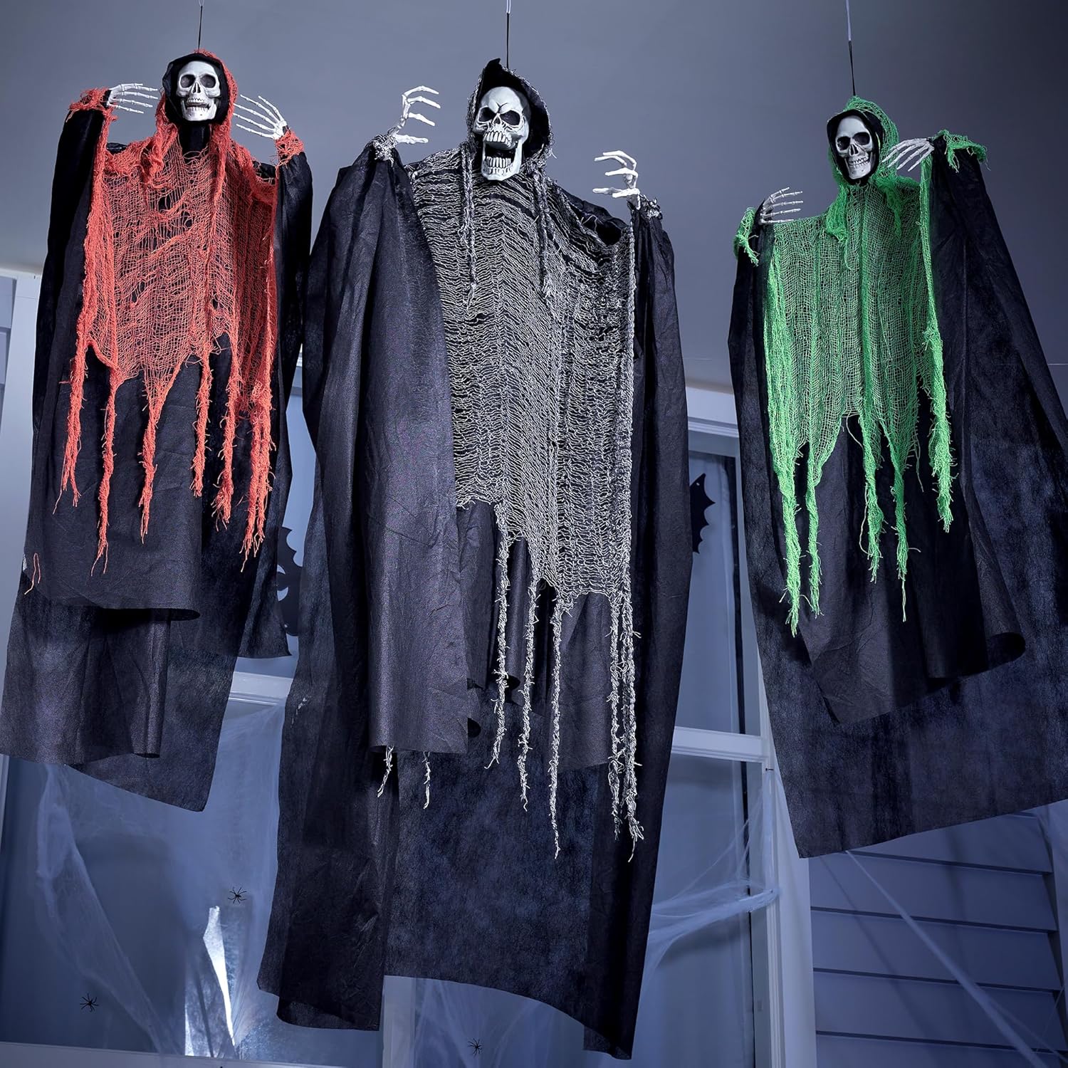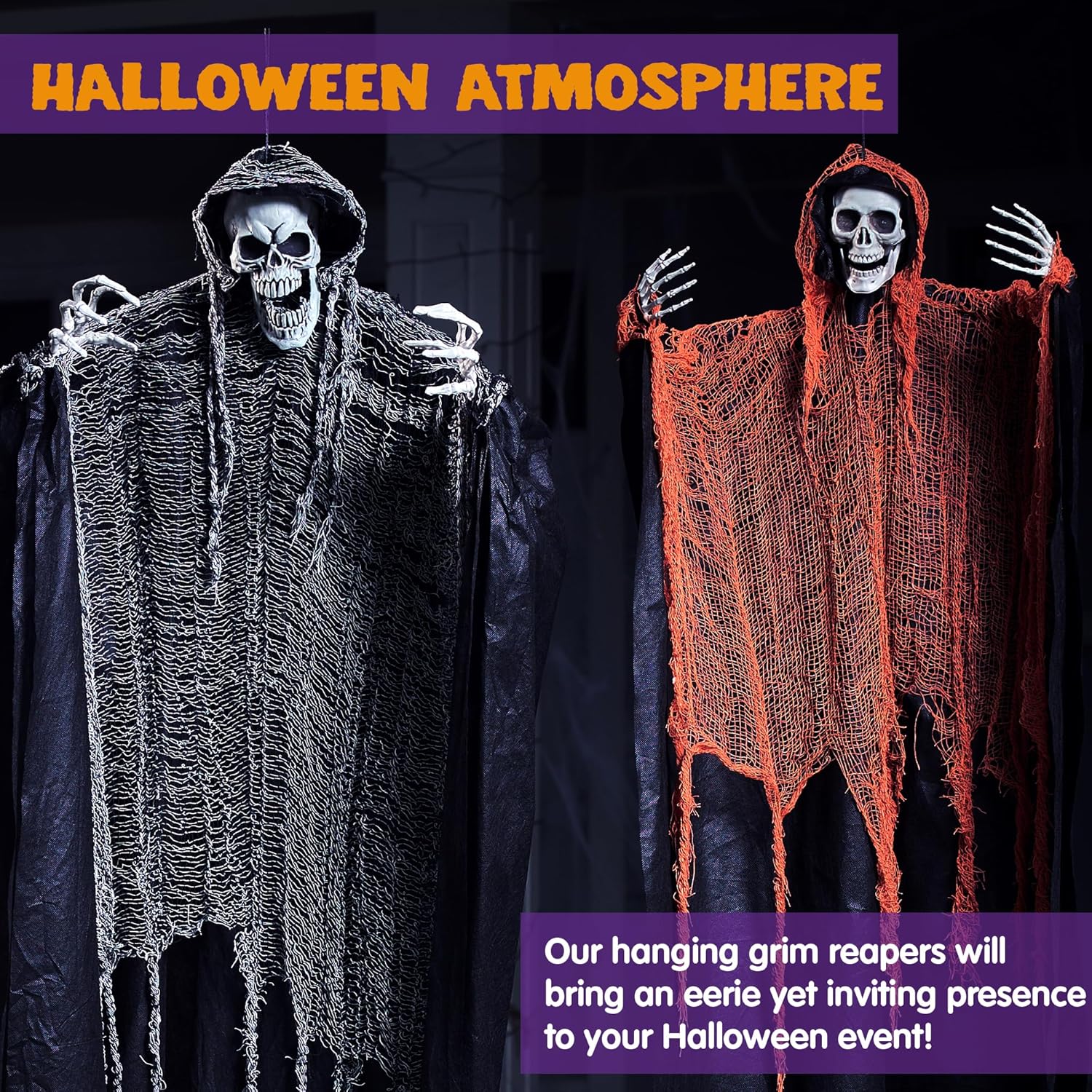 Perfect for Any Halloween Occasion. Whether you’re hosting a haunted house party, creating a spine-chilling yard display, or simply want to add a touch of Halloween spirit to your home, these hanging grim reapers are an ideal choice. Hang them from trees, porches, or any outdoor area to create an immersive and spooky atmosphere