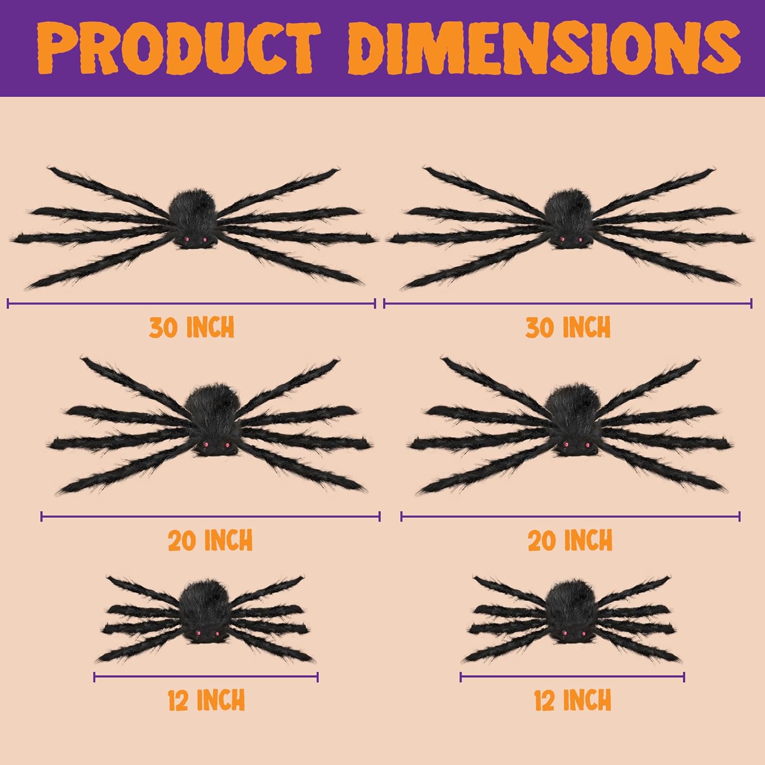 VALUE SET: JOYIN Halloween Black Spider Set comes with 6 black hairy spiders with different sizes (30 inch*2 , 20 inch*2, 12 inch*2). Perfect Halloween decoration for your home, office, Halloween parties, haunted houses & yard.