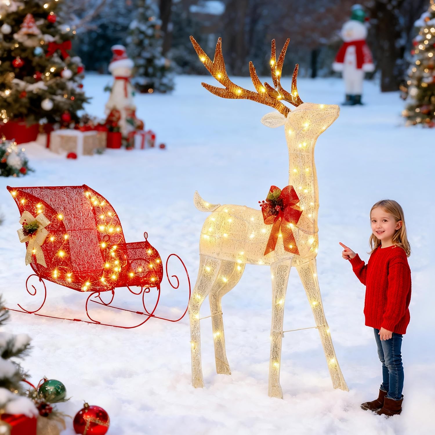 【Enchanting Holiday Centerpiece】Transform your home with this classic reindeer and sleigh—a piece of Christmas decor that captures the magic of the season. The elegant Christmas deer, adorned with a graceful neck bow, pulls a sleigh glowing with warm white LEDs. Ideal as a centerpiece for Christmas yard decorations, it brings heartwarming charm to any holiday scene, perfect for indoor or outdoor use.