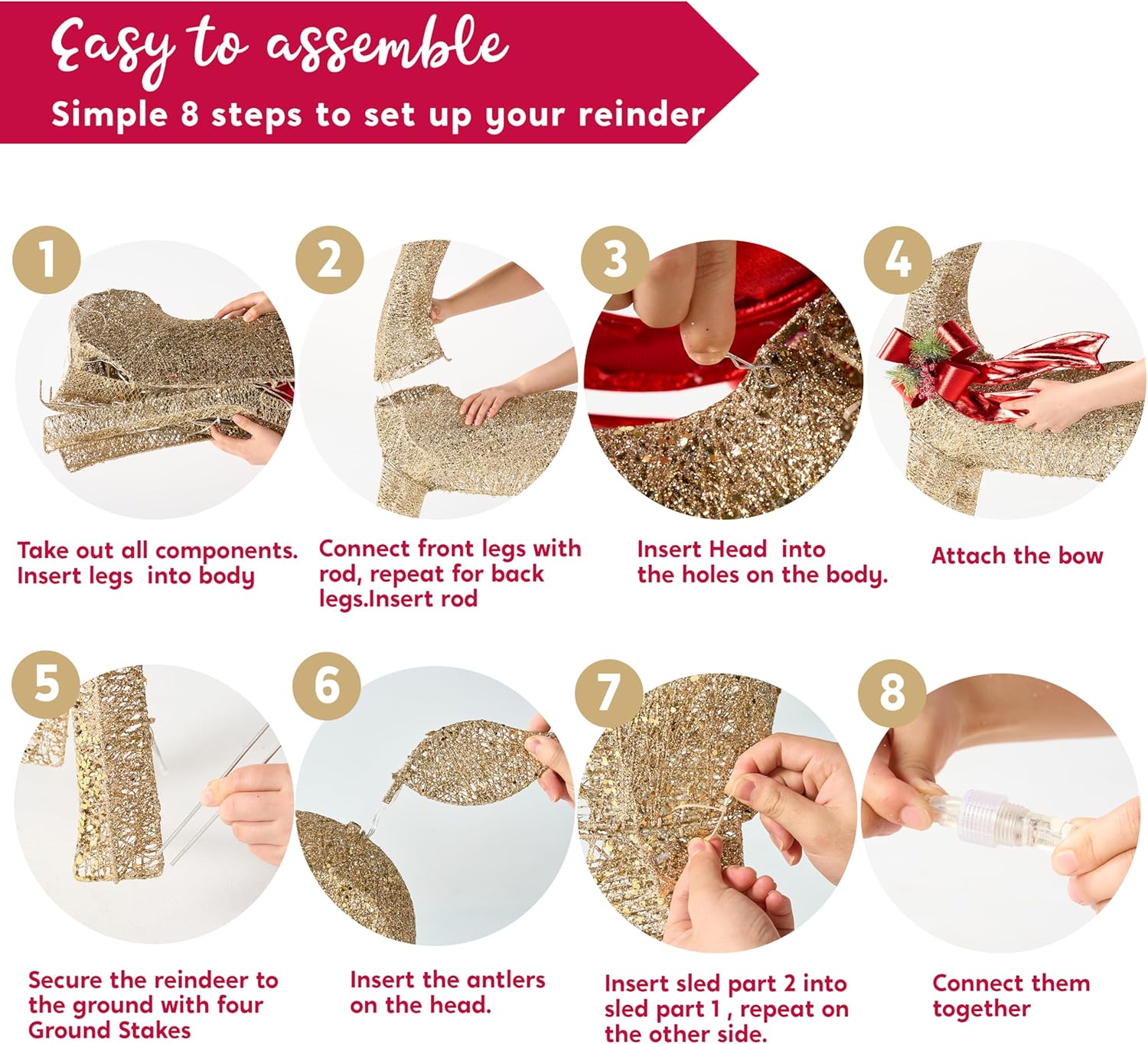 【Quick & Secure Assembly】Tool-free assembly in under 10 minutes with included instructions. Features 12 ground stakes & 24 zip ties for secure installation. Extra-Long 9.8FT power cord allows connection of multiple sets. After the season, simply disassemble and store flat in the original box. Perfect for quickly creating enchanting displays with outdoor reindeer Christmas decorations yard setups or other Christmas decorations for outside.