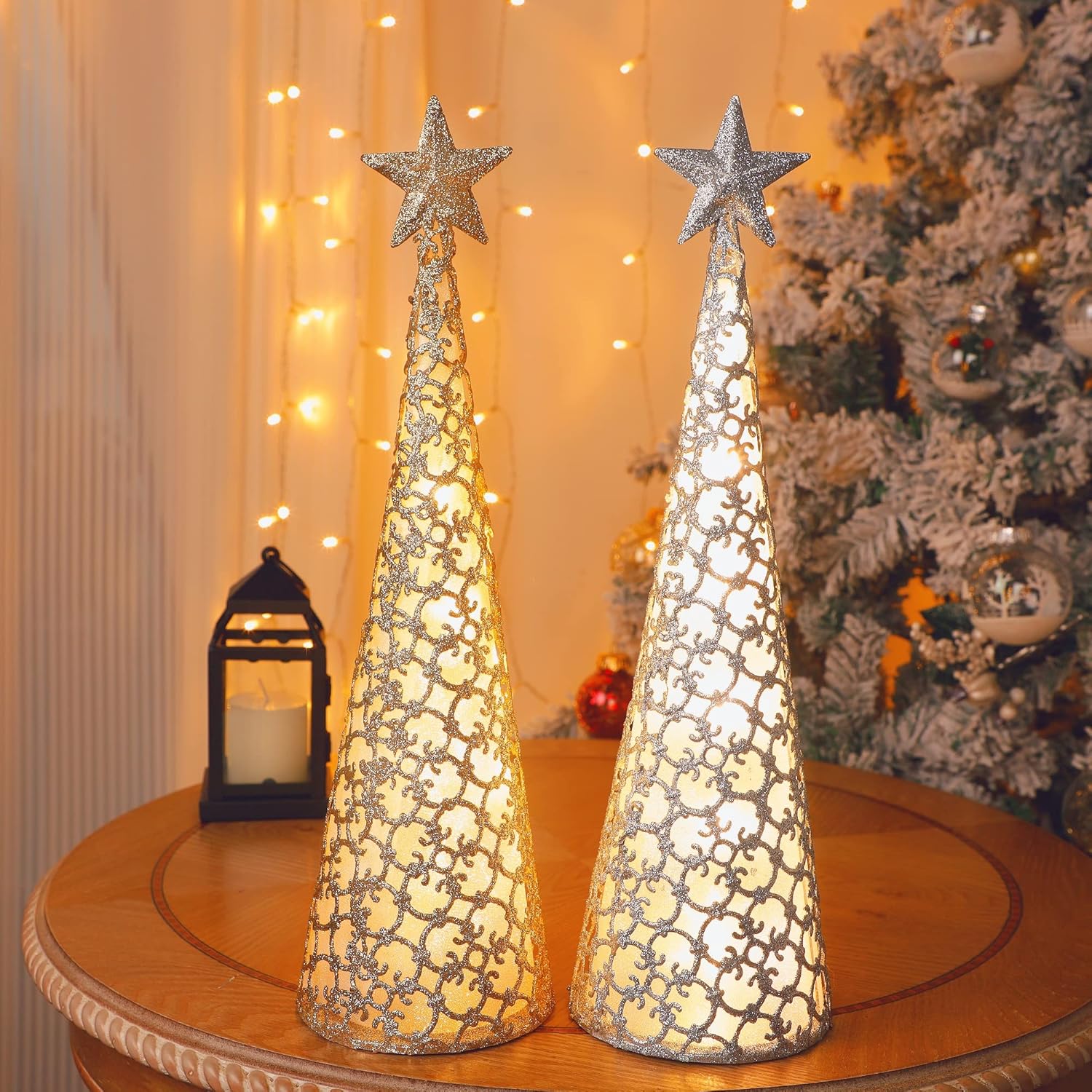 Christmas Table Top Decorations: Set of 2 light-up conical Christmas lanterns with warm white 10 LED brings holiday touch to your space. Design adding an elegant, festive atmosphere to your home decor centerpieces year after year.