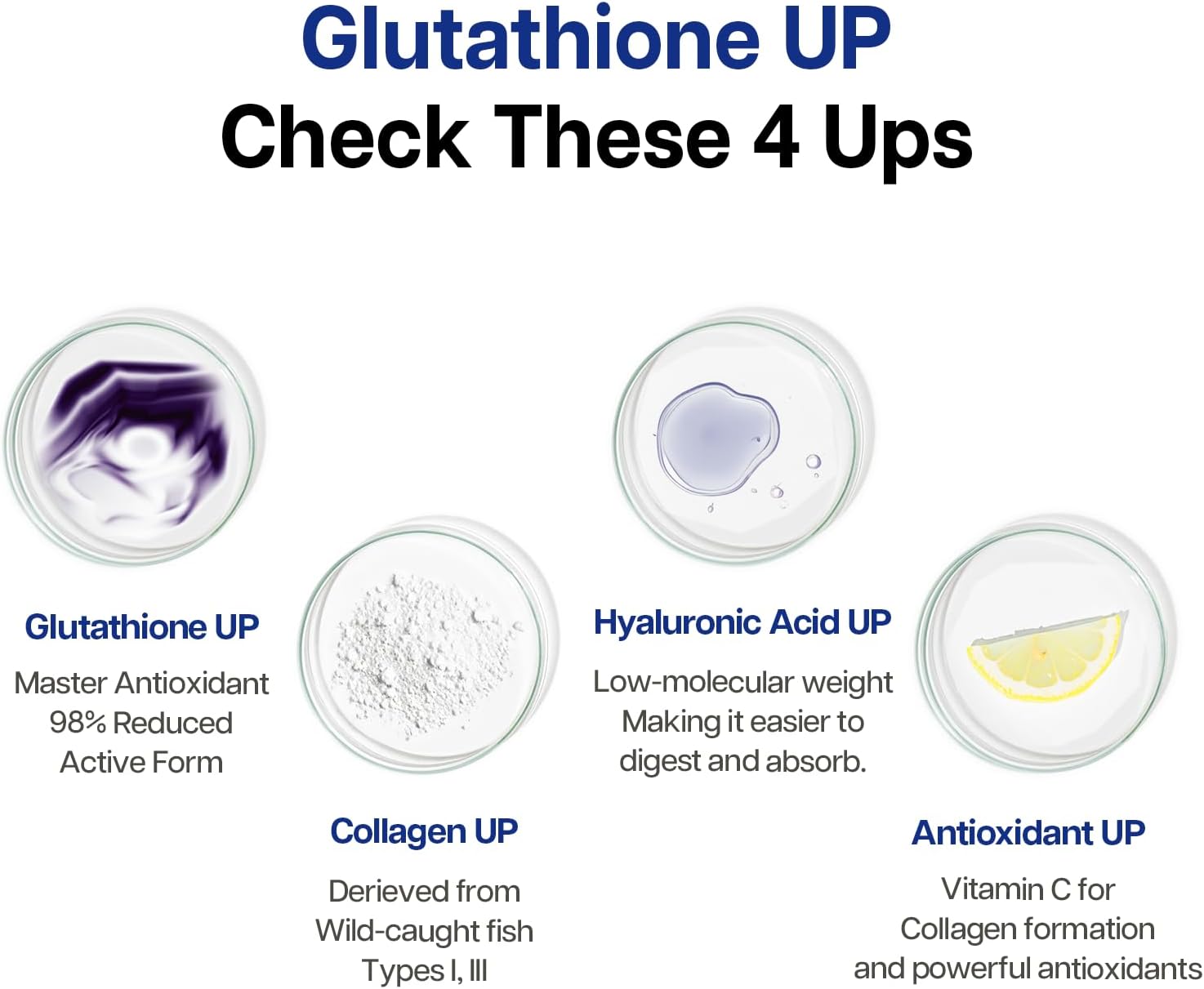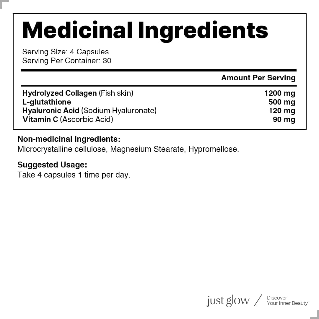 【Glutathione Formation】 Each serving of Just Glow Glutathione UP provides 500 mg of pure L-glutathione, 2000 mg of hydrolyzed marine collagen, 120 mg of hyaluronic acid, and 90 mg of vitamin C.