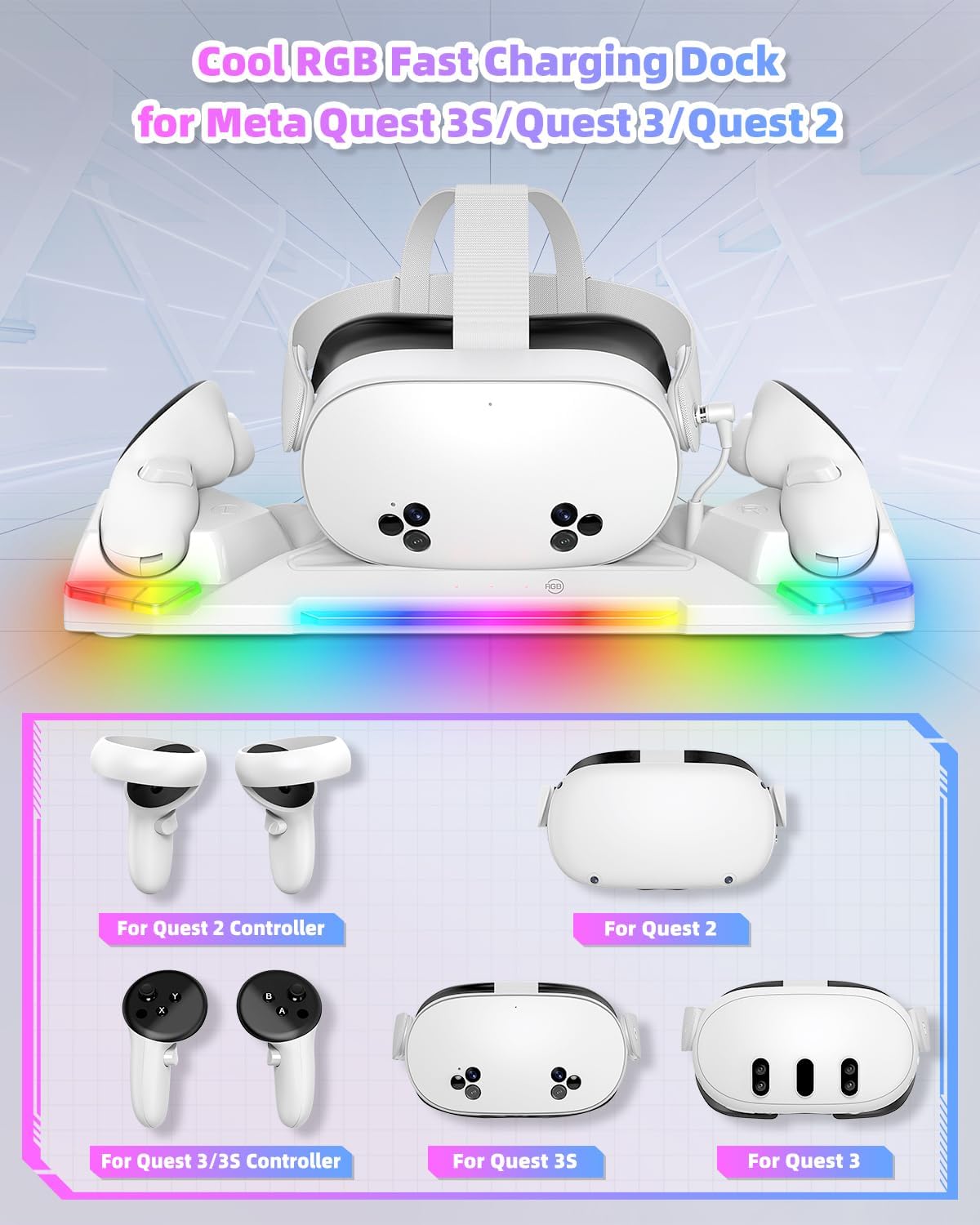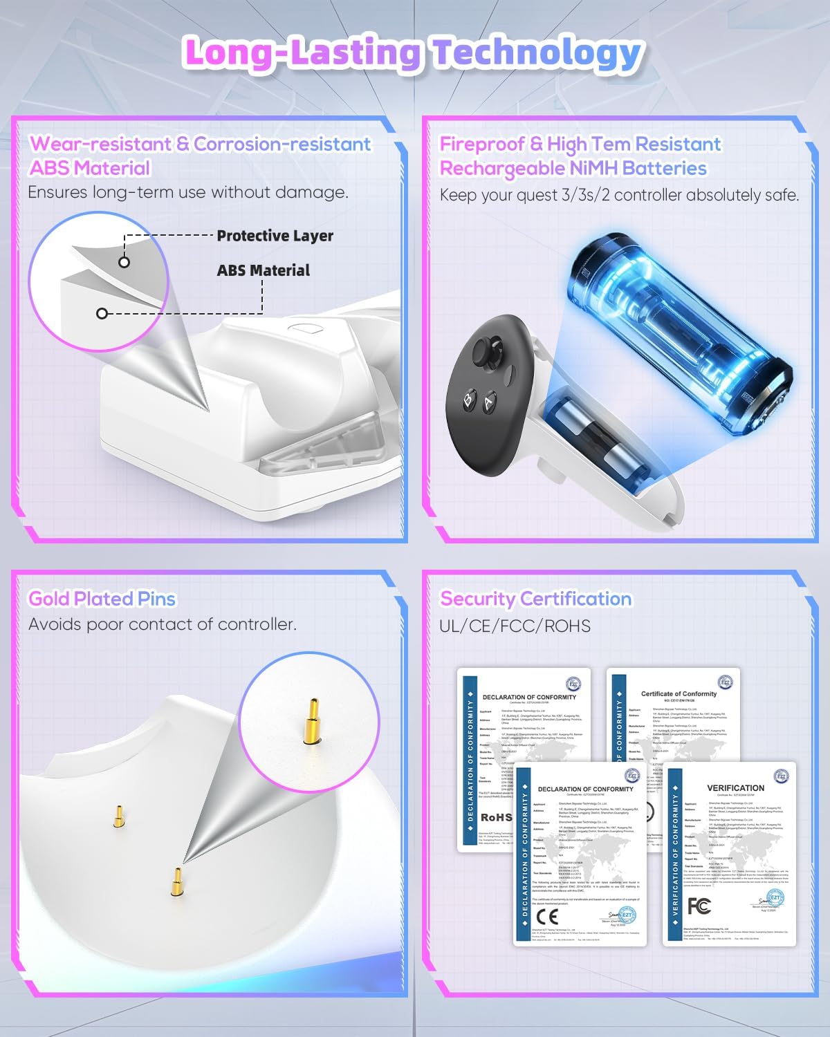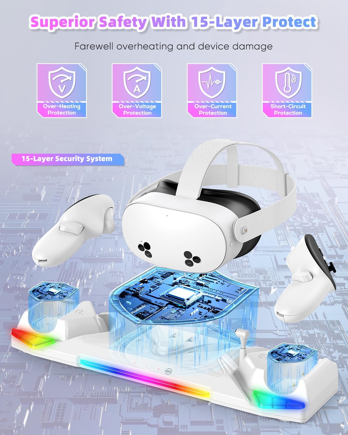 30W Safe & Fast Charging: Equipped with PD 30W fast-charging adapter, for this for meta quest 3/3s/2 charging dock simultaneously charges your for Oculus Quest 3S/3/2 headset and controllers in just 2 hours (headset) and 3.5 hours (controllers), 33.3% faster than other charging docks. Features 15-layer protection including overcharge and short-circuit prevention for ultimate safety. UL, CE, RoHS, FCC certified manufacturing quality