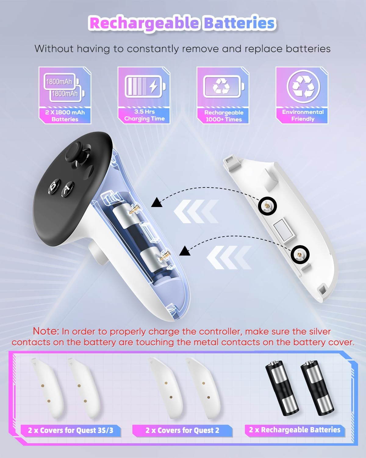 Eco-Friendly & Cost-Effective: This charger dock for meta quest 3s/3/2 includes 2 NiMH rechargeable batteries (1,000+ cycles) and controller covers for Meta Quest 3S/3 and for Quest 2. Save money on disposable batteries while reducing environmental waste.