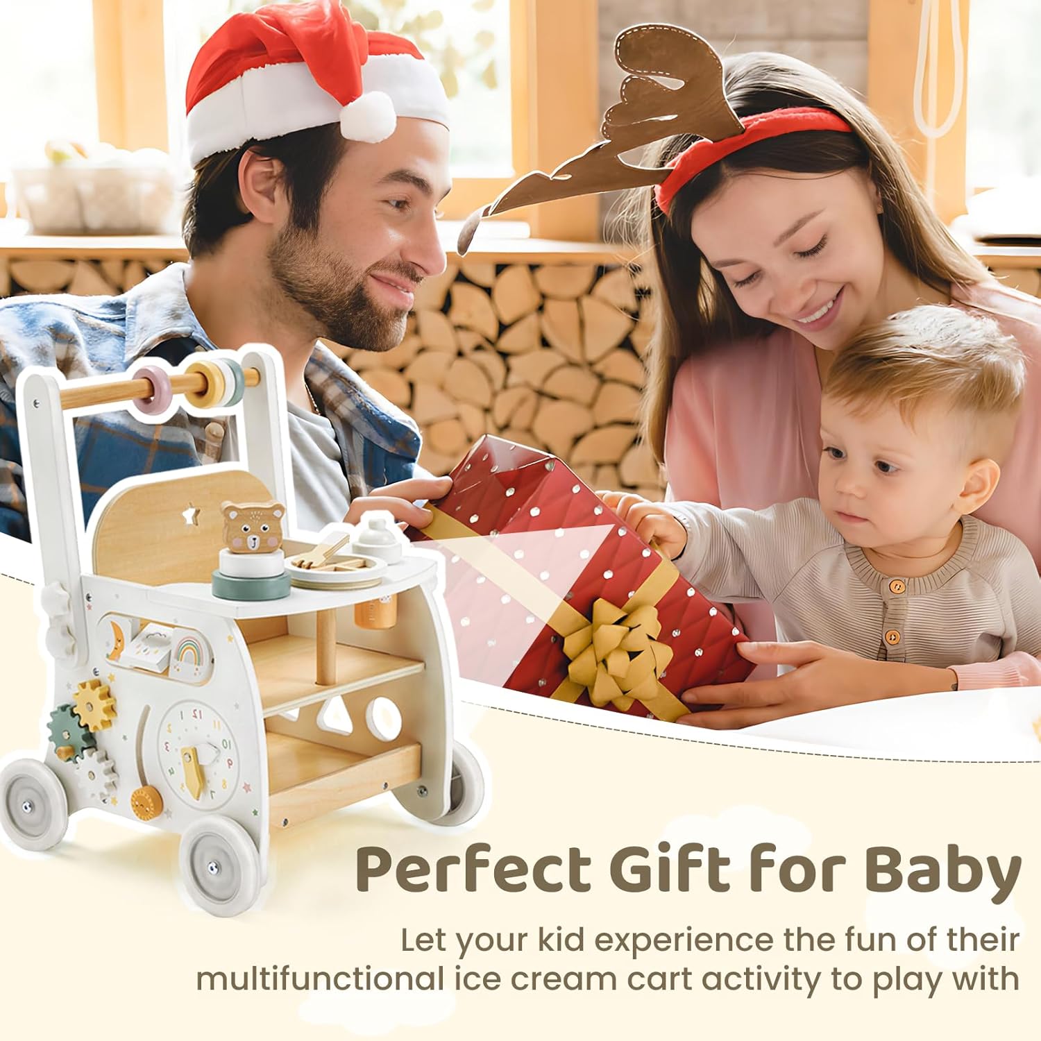 Funny Activity Center Play: This push and pull walker comes with countless fun activities for your toddler to play with, word flipper, spinning gear, sun buttons, clock, shape sorter, tracing game, dinner plate, fork, bottle, bear stacking game. Designed with a vibrant theme.