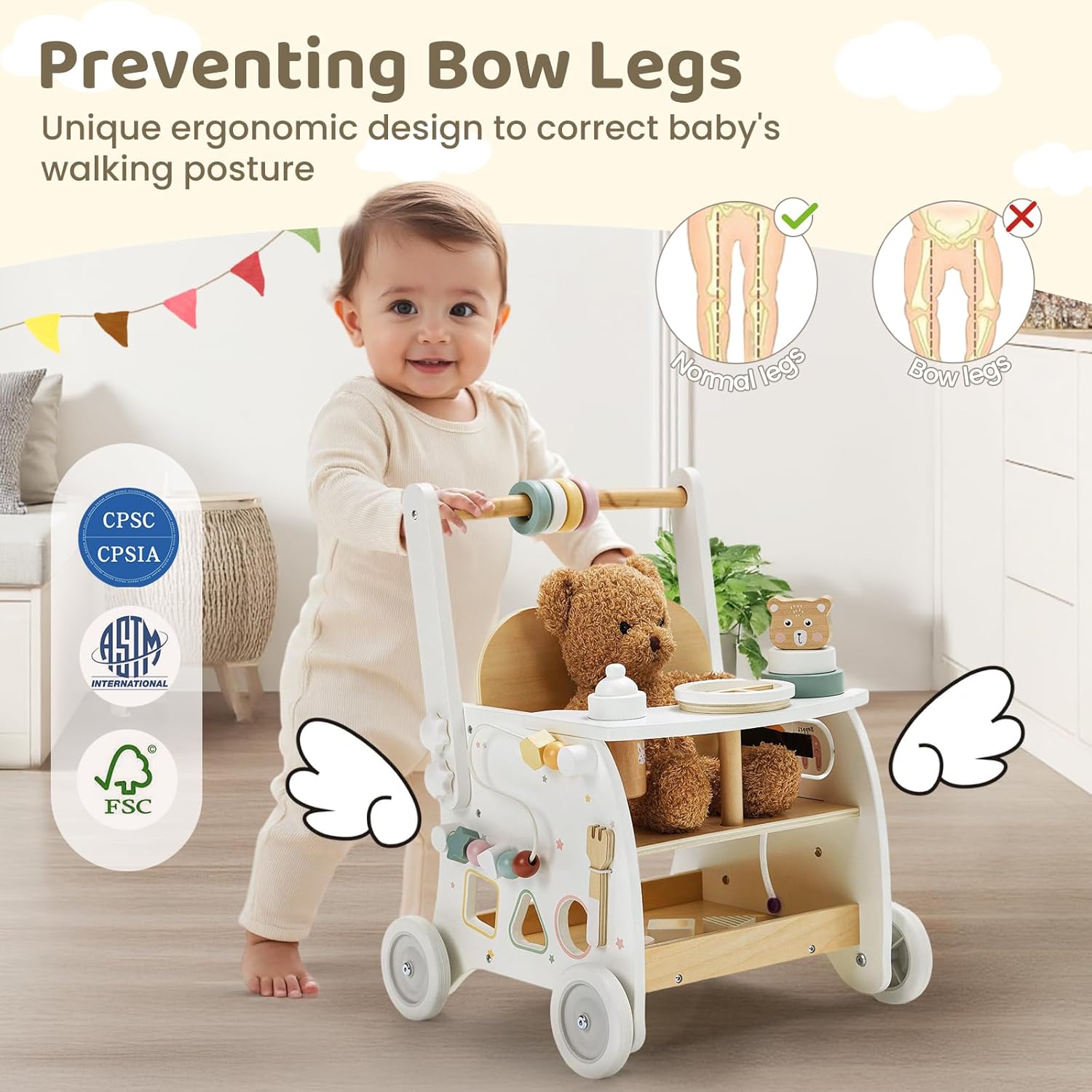 Safe & Certified Material:Solid Wood and MDF (Medium Density Fiber) are used to make strong structure. All the Materials & Paints are strict to the Toys Safety Standards ASTM/CE in USA and EN71 CE in Europa. The Edges are Round Polished to Prevent Injury. Unique design makes the wooden baby walker a Nice Gift for Toddlers 18 Months and over Boys and Girls.