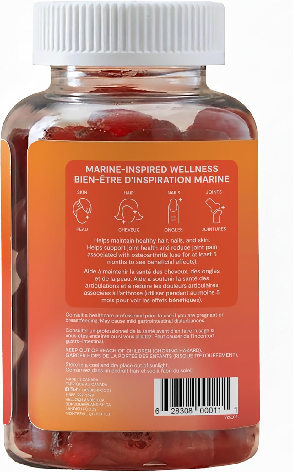 Support your beauty from within with these delicious marine collagen gummies. Natural Health Product licensed by Heath Canada with the following benefits: helps to support healthy skin, hair, and nails; helps in collagen formation to support healthy bones, cartilage, joints, teeth, and gums; helps to reduce joint pain associated with osteoarthritis; helps in wound healing and connective tissue formation; provides antioxidants that help protect against oxidative damage to cells caused by free radicals; helps in energy metabolism.