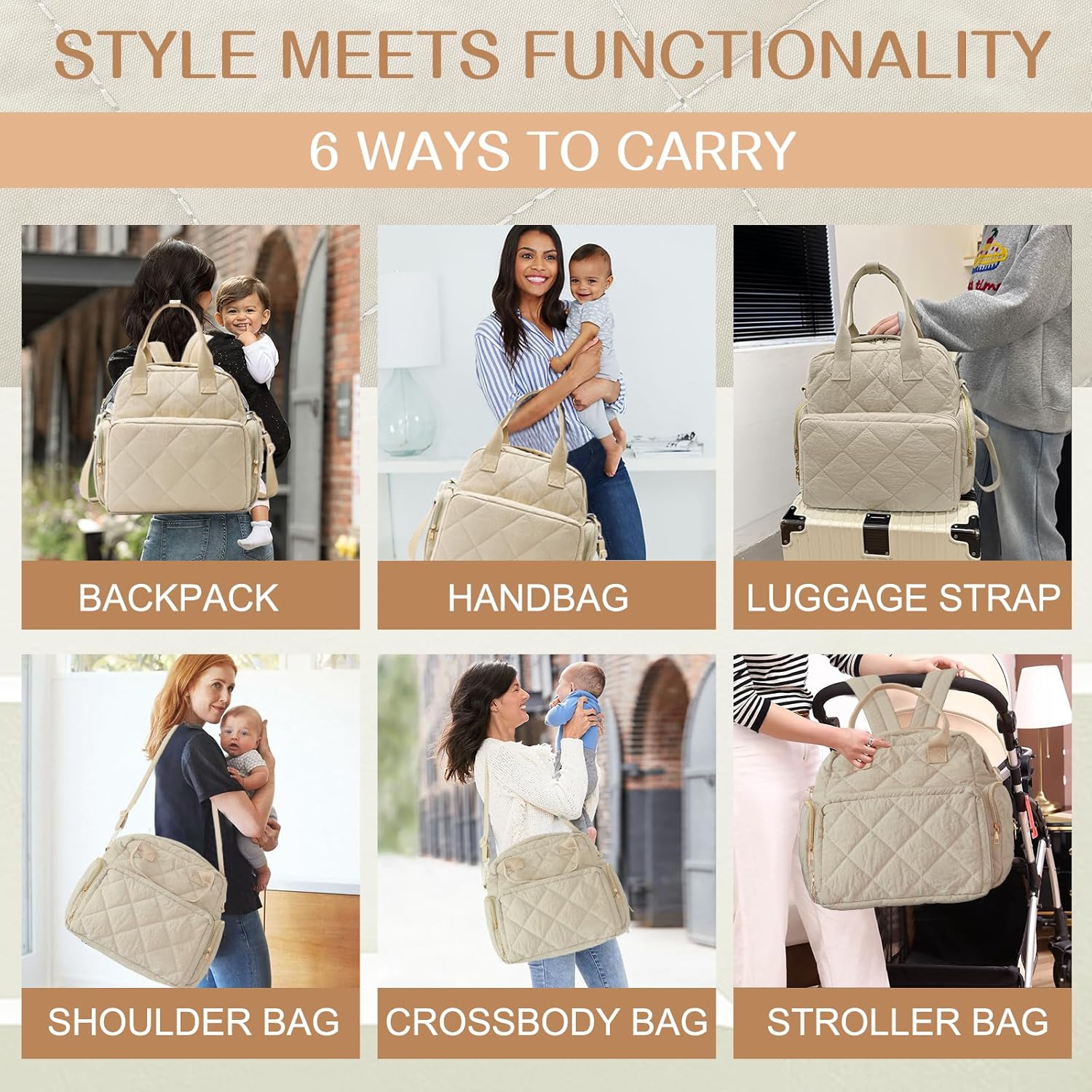 【6 CARRY MODES】This diaper bag offers a unique convertible design that can be converted into 6 different styles: crossbody bag for women, women’s shoulder bag, diaper backpack, tote bag for women, luggage bag/travel bags or hang on the stroller. If you change the style every day, this baby bag is your 6-in-1 solution. The diaper bag is equipped with an adjustable and detachable 24-43″ long shoulder strap. The backpack shoulder strap can be hidden in the back pocket.
