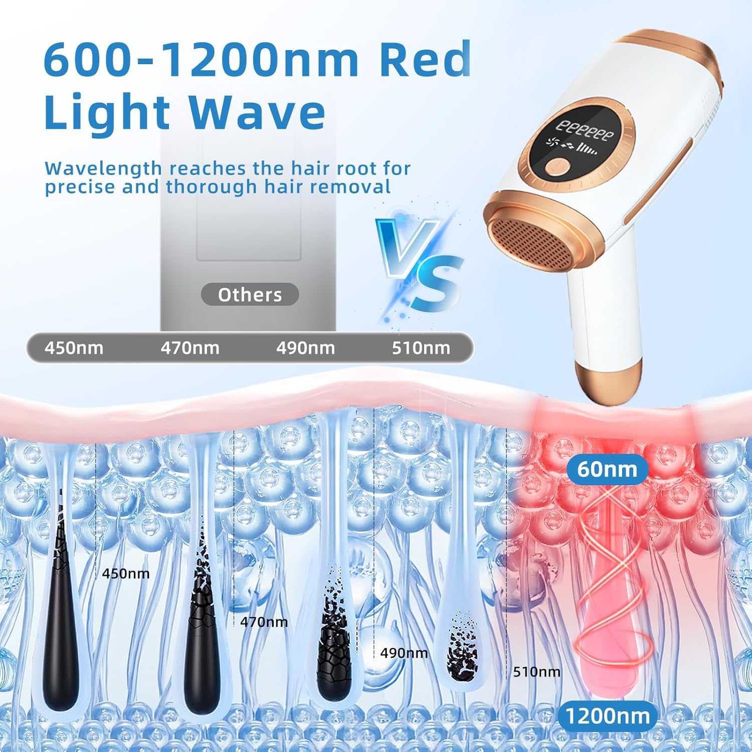 【Advanced IPL Red Wave Technology】 Using 600~1200nm long red wavelength light, this device penetrates deep into hair follicles to target melanin and disrupt hair growth cycles. Achieve permanent results by forcing follicles into dormancy .