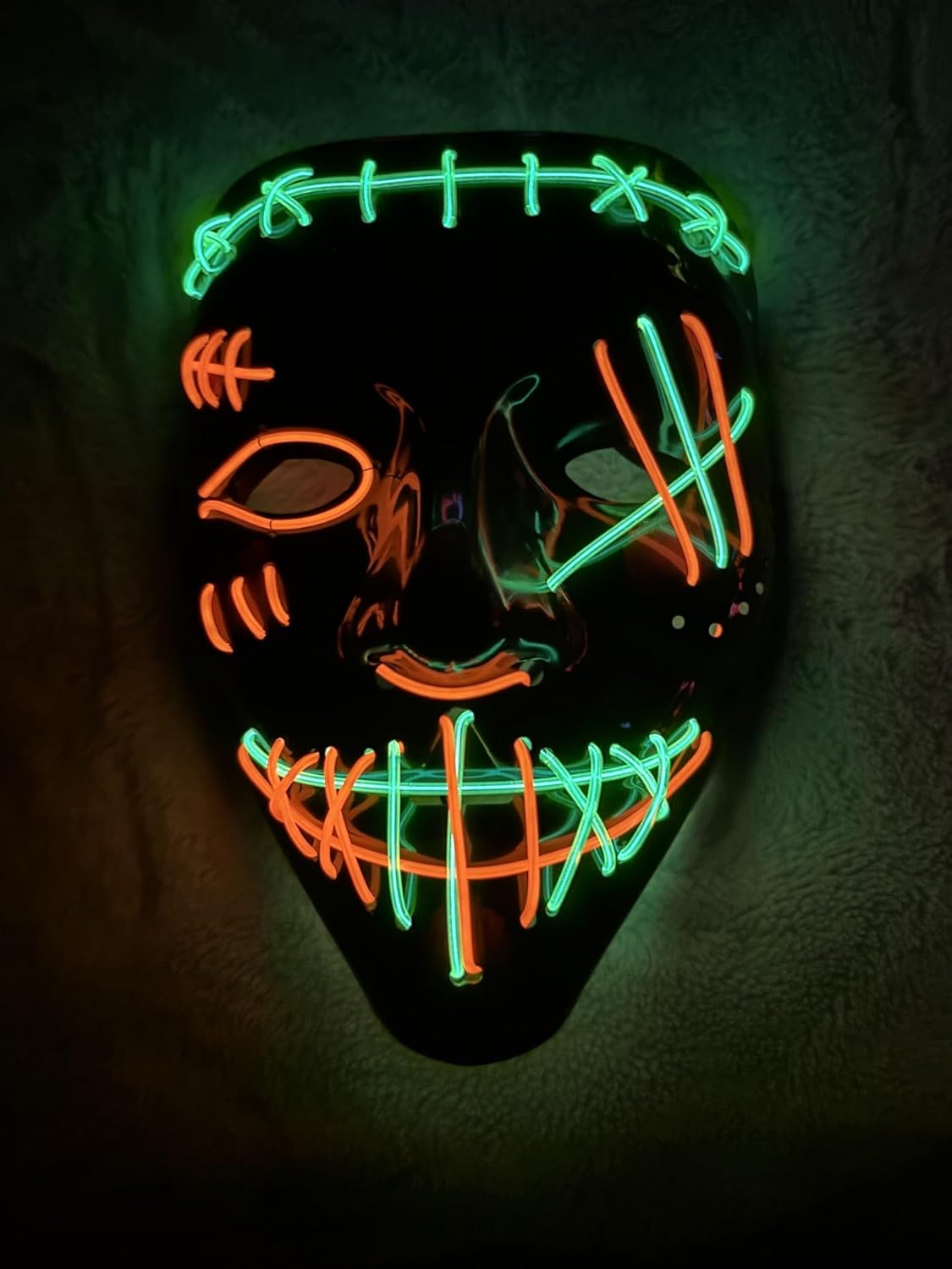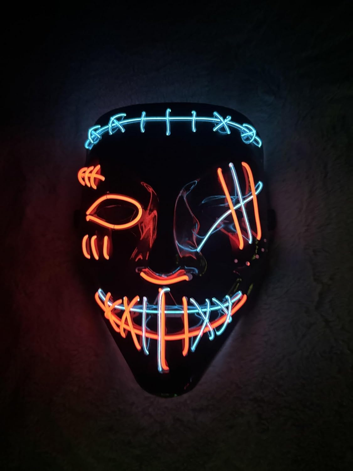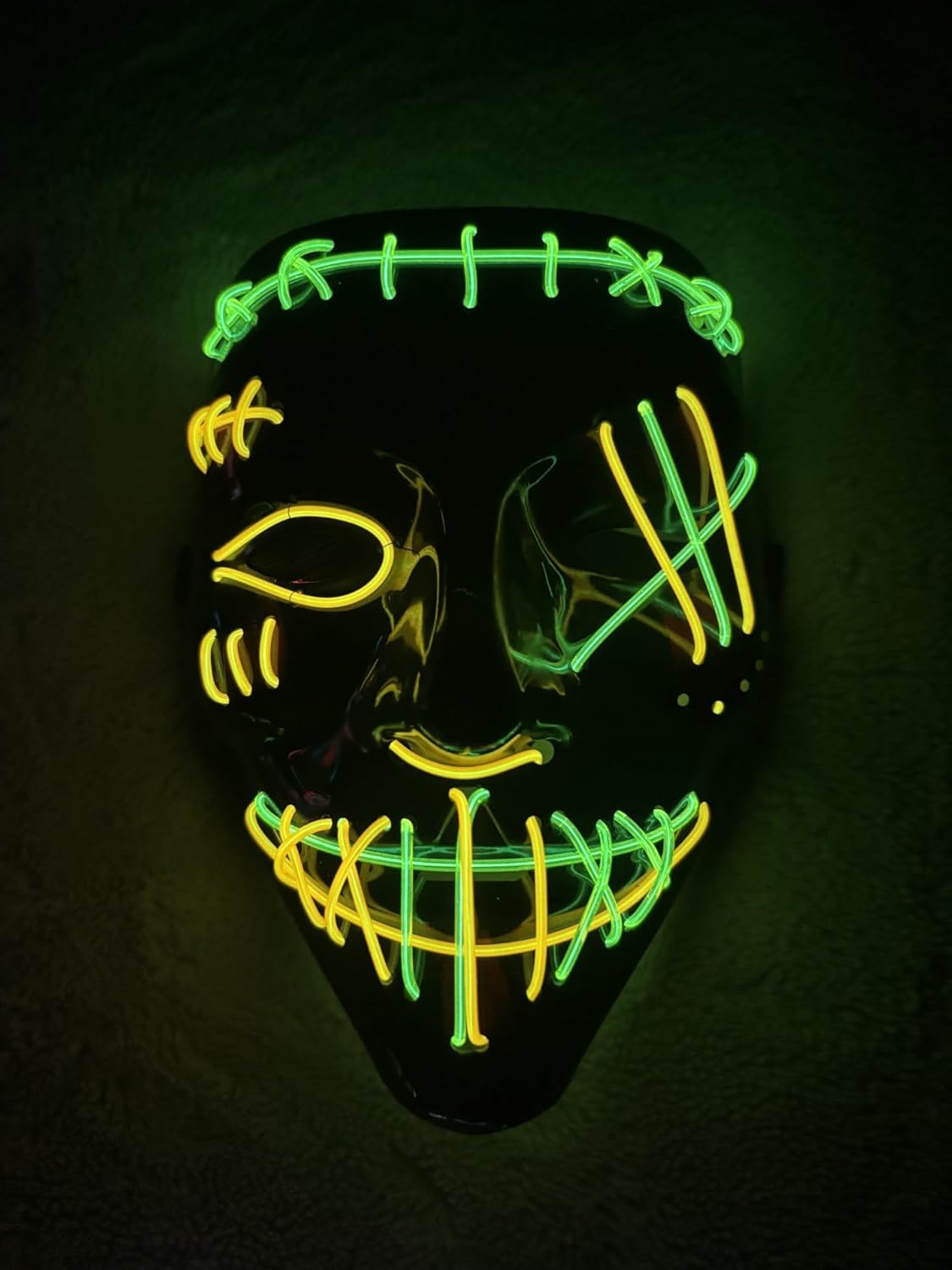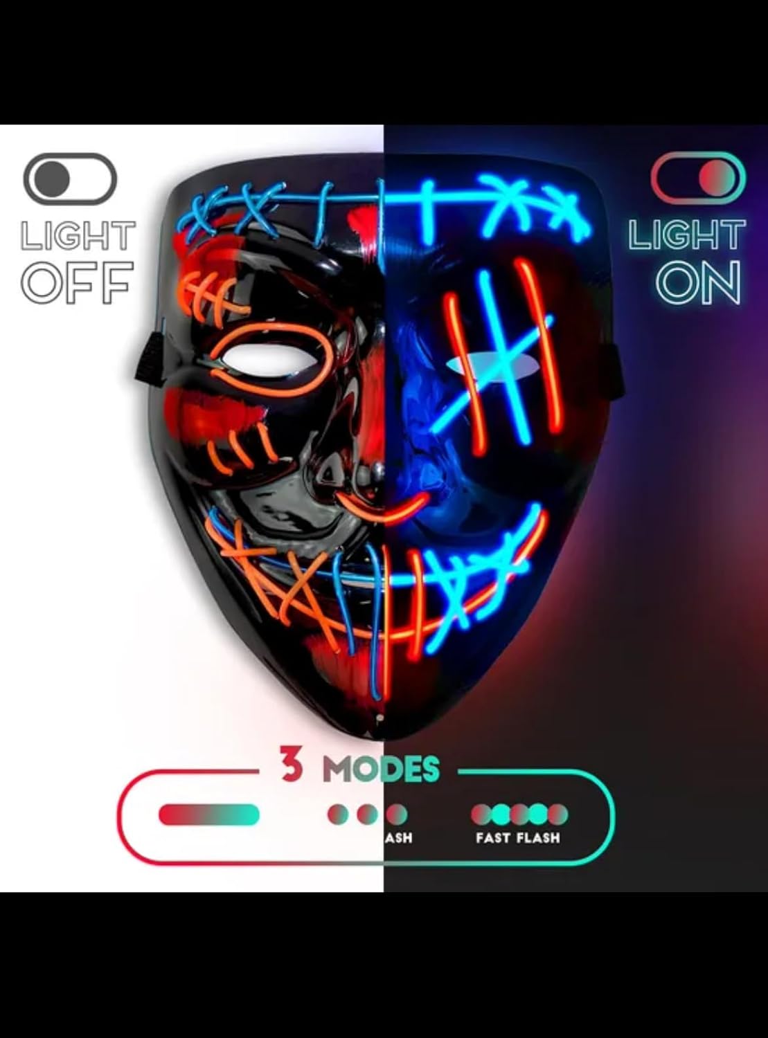 Transform your Halloween or costume party experience with this striking LED mask featuring captivating neon-style illumination. The mask showcases an impressive array of multi-coloured LED lights creating an eerie, attention-grabbing effect against its black base. With three distinct lighting modes, you can switch between different patterns to match your mood or the party atmosphere. The mask features various colour combinations including vibrant blue, red, green, and yellow elements arranged in a distinctive pattern. Its convenient on/off switch allows easy control, while the different flash settings add dynamic visual interest to your costume. Perfect for Halloween celebrations, costume parties, festivals, or any event where you want to make a memorable impression. The mask’s design provides both dramatic visual impact and practical wearability. Please note that batteries are required for operation (battery specifications provided separately). The durable construction ensures the mask can be used for multiple events, while its universal size accommodates most adults comfortably.