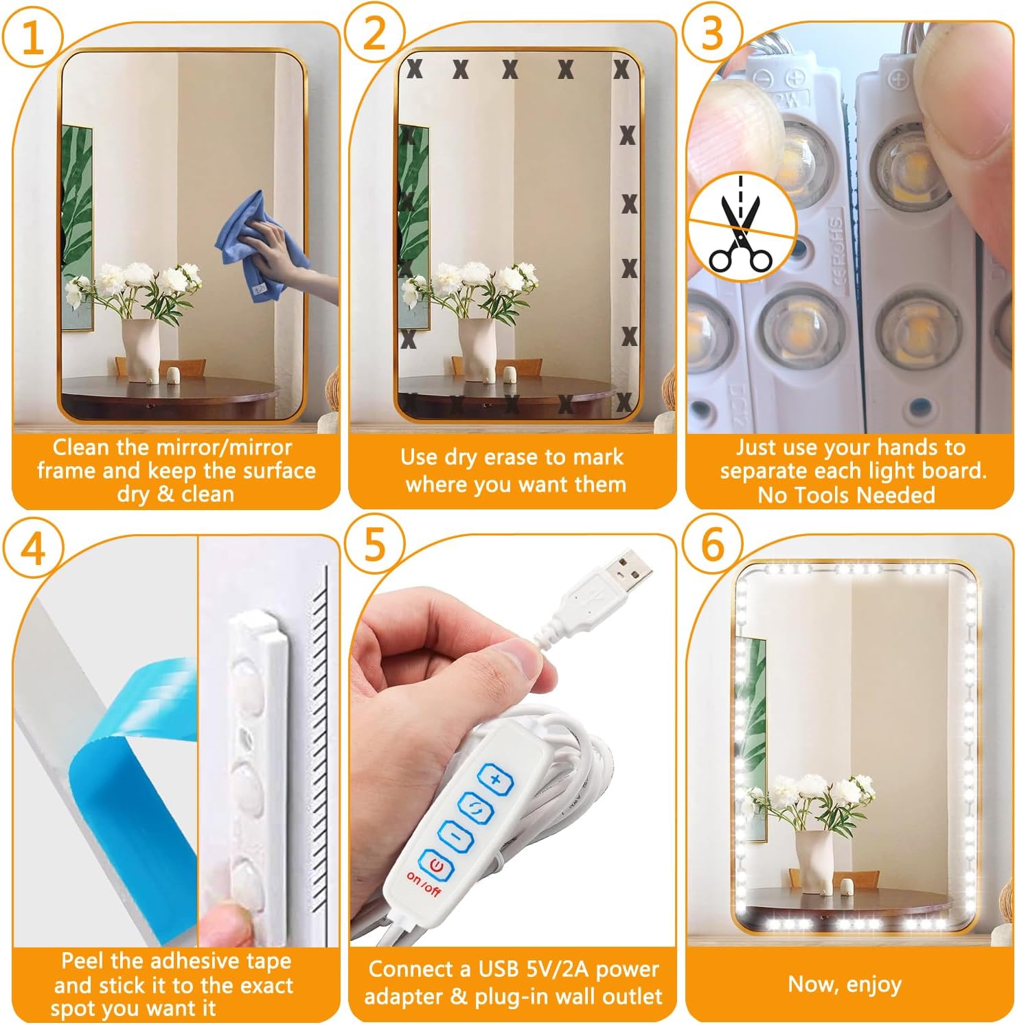 Led vanity mirror lights is easy to install, fits any shape of mirrors. Peel off and stick; Plug and play. Enjoy instant illumination in a few minutes. Super Stick,won’t drop down off easily.