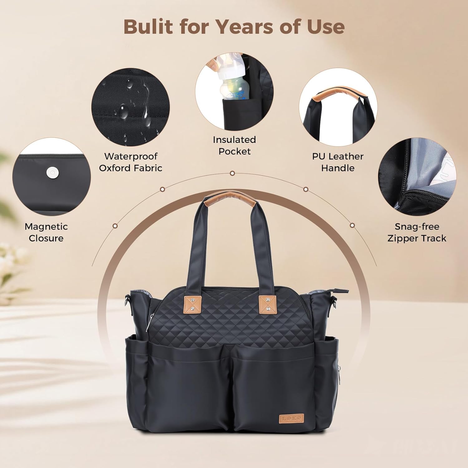 Durable & Waterproof Diaper Bag: Crafted from high-quality polyester, this waterproof diaper bag tote is durable, lightweight, and easy to clean. Comes with a changing pad and stroller clips for on-the-go convenience. The detachable, adjustable shoulder strap allows crossbody use, while long tote handles make it a versatile mommy tote bag—perfect for everyday use, travel, or as a baby shower gift.