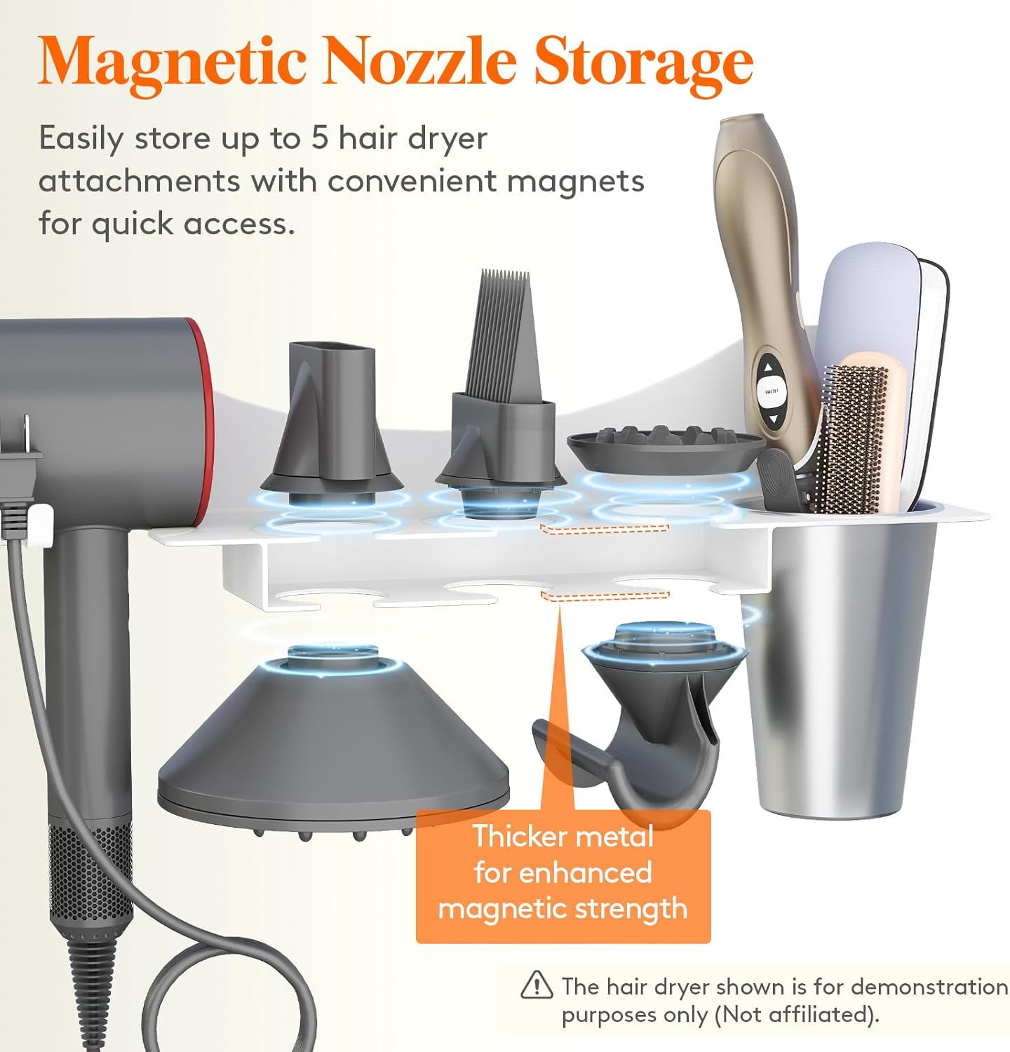 Magnetic Nozzle Storage: Each slot securely holds 1 to 5 magnetic hair dryer nozzles, allowing for easy access and effortless organization. Quickly grab the nozzle you need and return any you don’t need, saving you time and effort during your styling routine