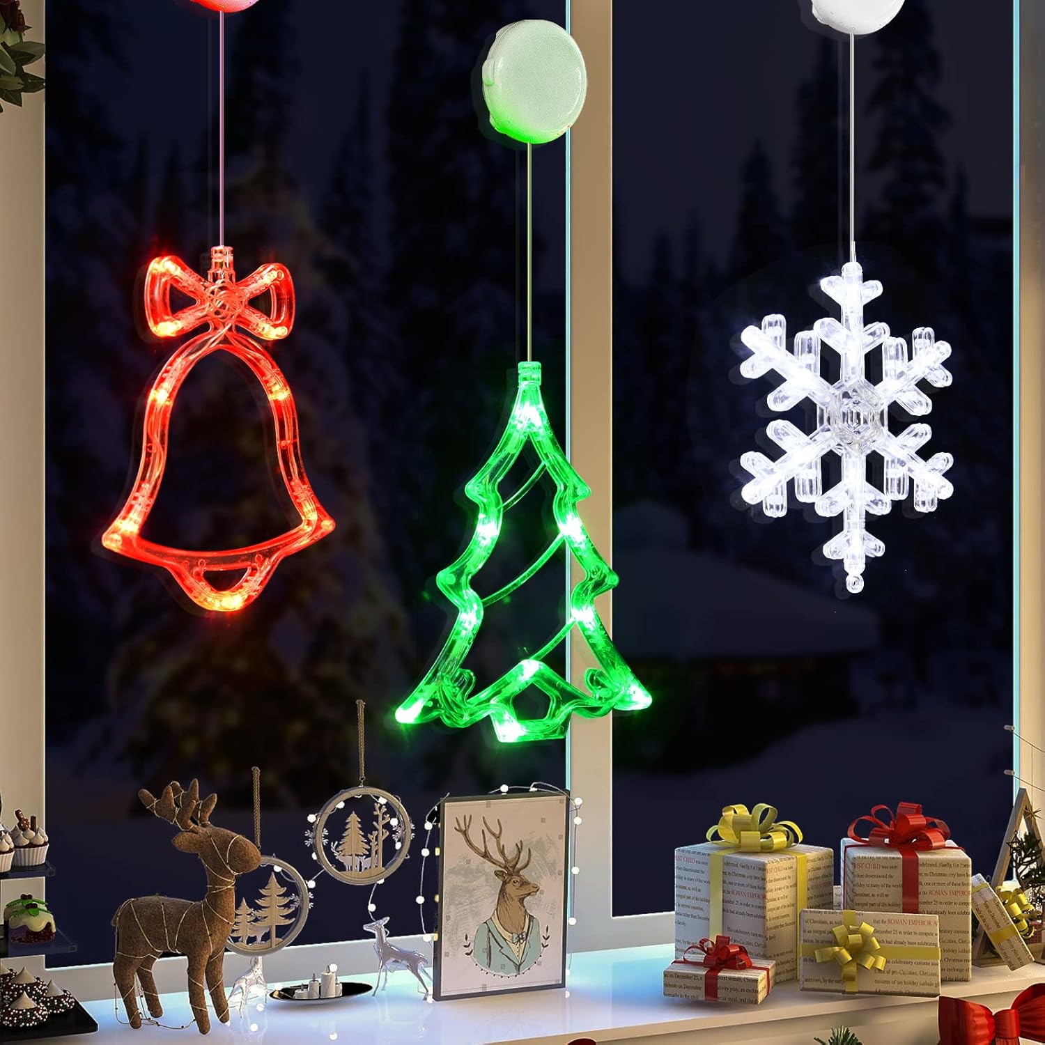 CHRISTMAS DECORATIONS: You will get three Christmas LED hanging window lights in the shape of a red bell, a green Christmas tree, and a white snowflake, and they come with suction cups. The Christmas window ornament diameter is 7.9 inches, and the string drops 16 inches. Our Christmas themed window lights are ideal for Christmas window decoration.