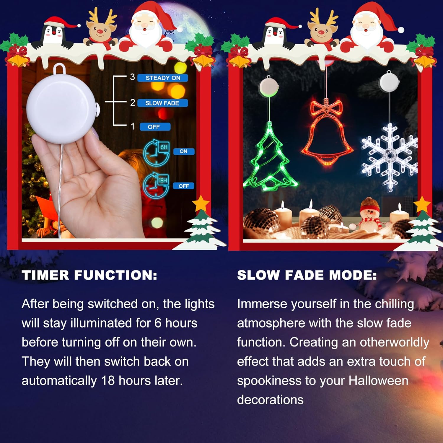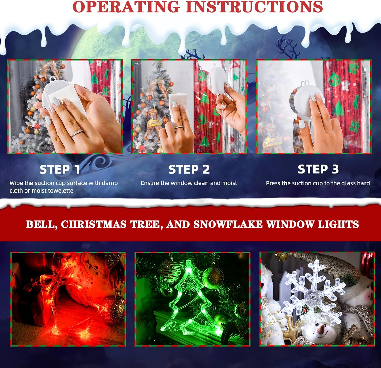 EASY FOR HANGING: Our Christmas window lights come with suction cups and hooks, which can be easily installed on glass, gates, cabinets, etc., and the height can be adjusted according to the fixed position, make sure that the suction cup is clean before installation, adding appropriate water to increase the adhesion.
