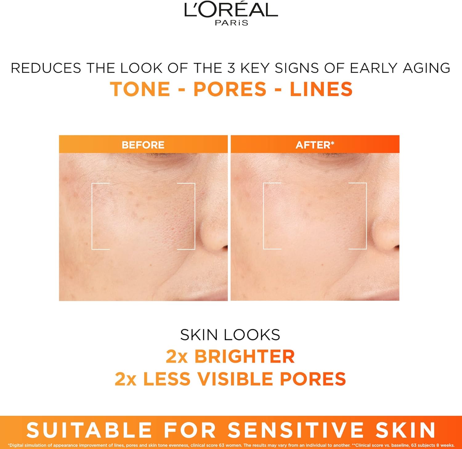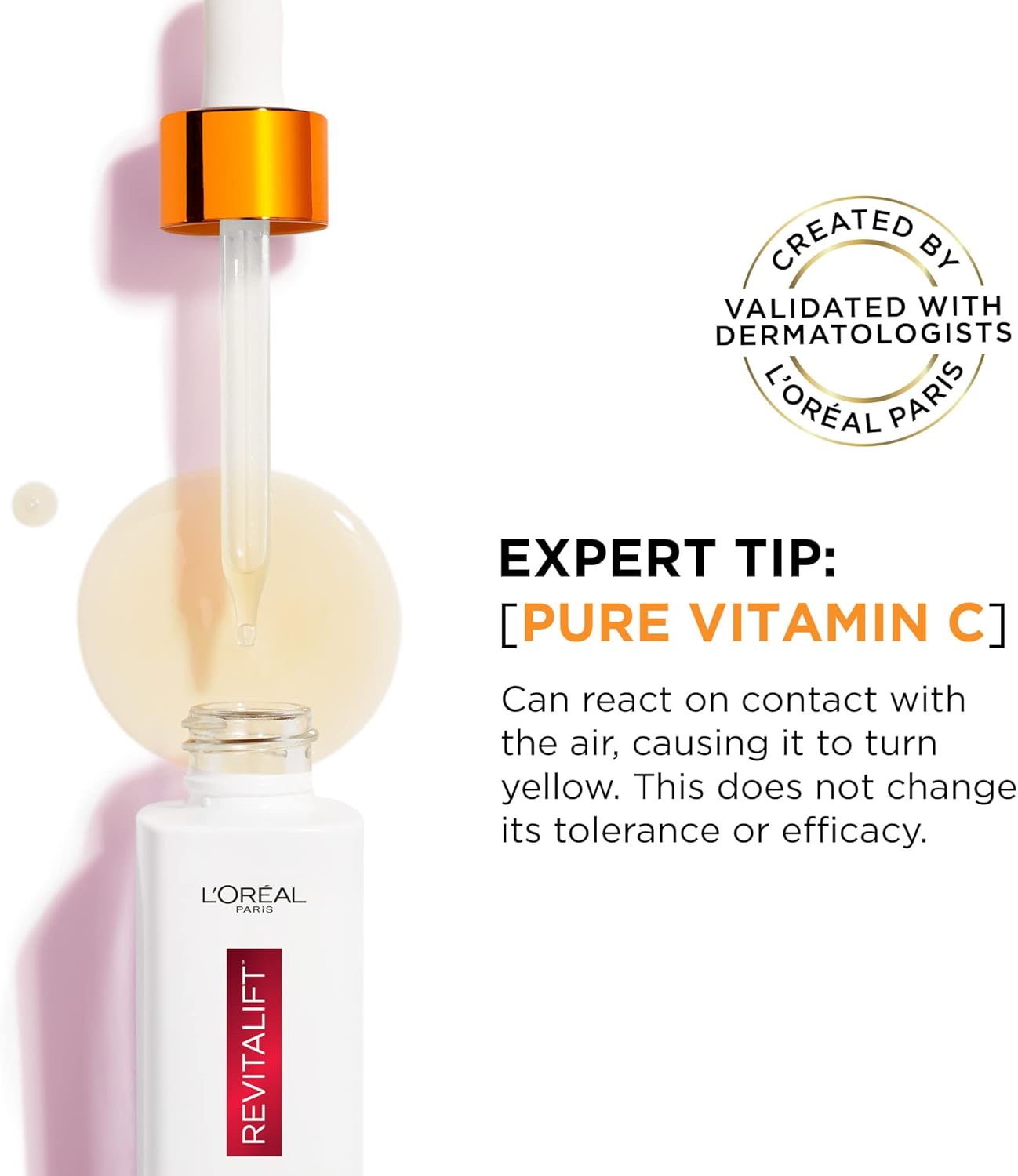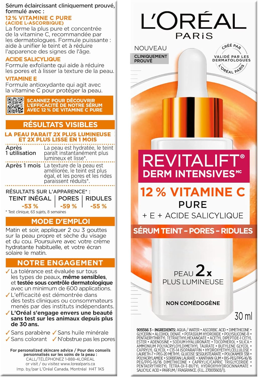 Dare to try the power of L’Oréal Paris Revitalift Derm Intensives 12% Pure Vitamin C + E + Salicylic Acid Face Serum. A cutting-edge skincare solution that delivers 2X brighter looking skin in 4 weeks and 2X less visible pores in 8 weeks. This non-greasy, fast absorbing formula is designed to visibly correct the 3 key signs of aging: uneven tone, enlarged pores, and fine lines. Skin looks 70% brighter, feels 83% smoother, with pores 59% less visible in 8 weeks! This 12% concentration, high-performance serum is powered by Pure Vitamin C (L-Ascorbic Acid), the most potent form of Vitamin C, to visibly brighten and even skin tone. Working in synergy, Vitamin E, a powerful antioxidant, helps protect against environmental damage, while Salicylic Acid gently exfoliates to refine texture and minimize the look of pores. The result? Visibly brighter, more radiant, younger-looking skin.