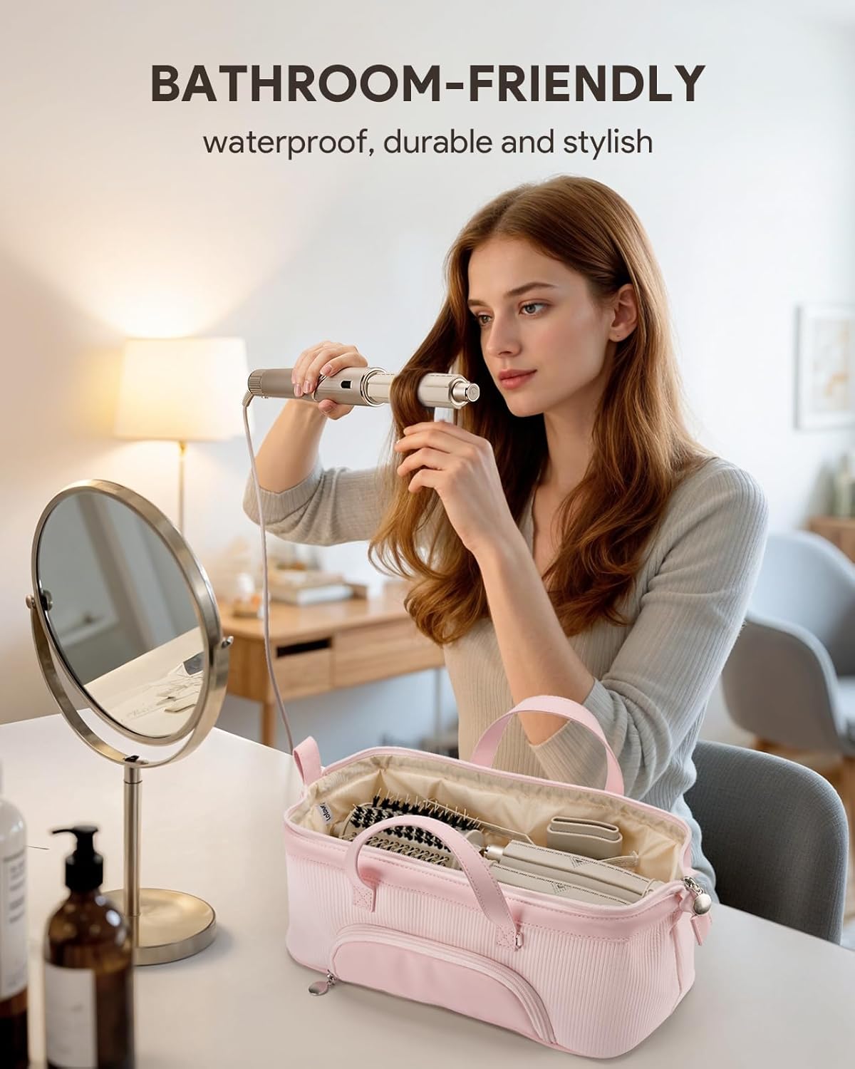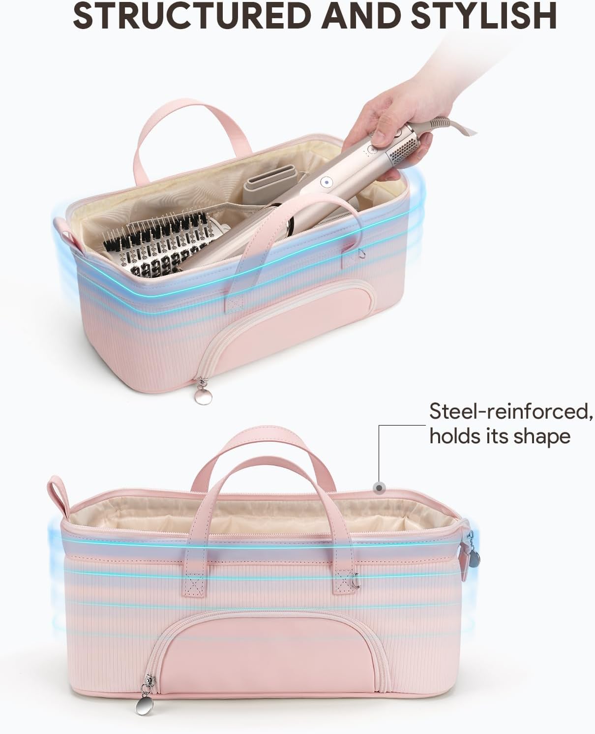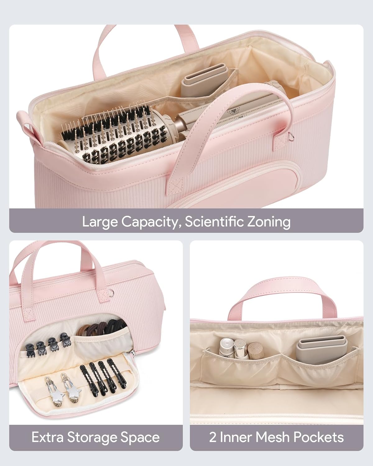 Scientific Partition: Spacious storage space, embedded steel wire support, so that the storage bag always maintains a firm shape, not collapsed, the internal mesh pockets can store hair care oil, curling iron and other tools
