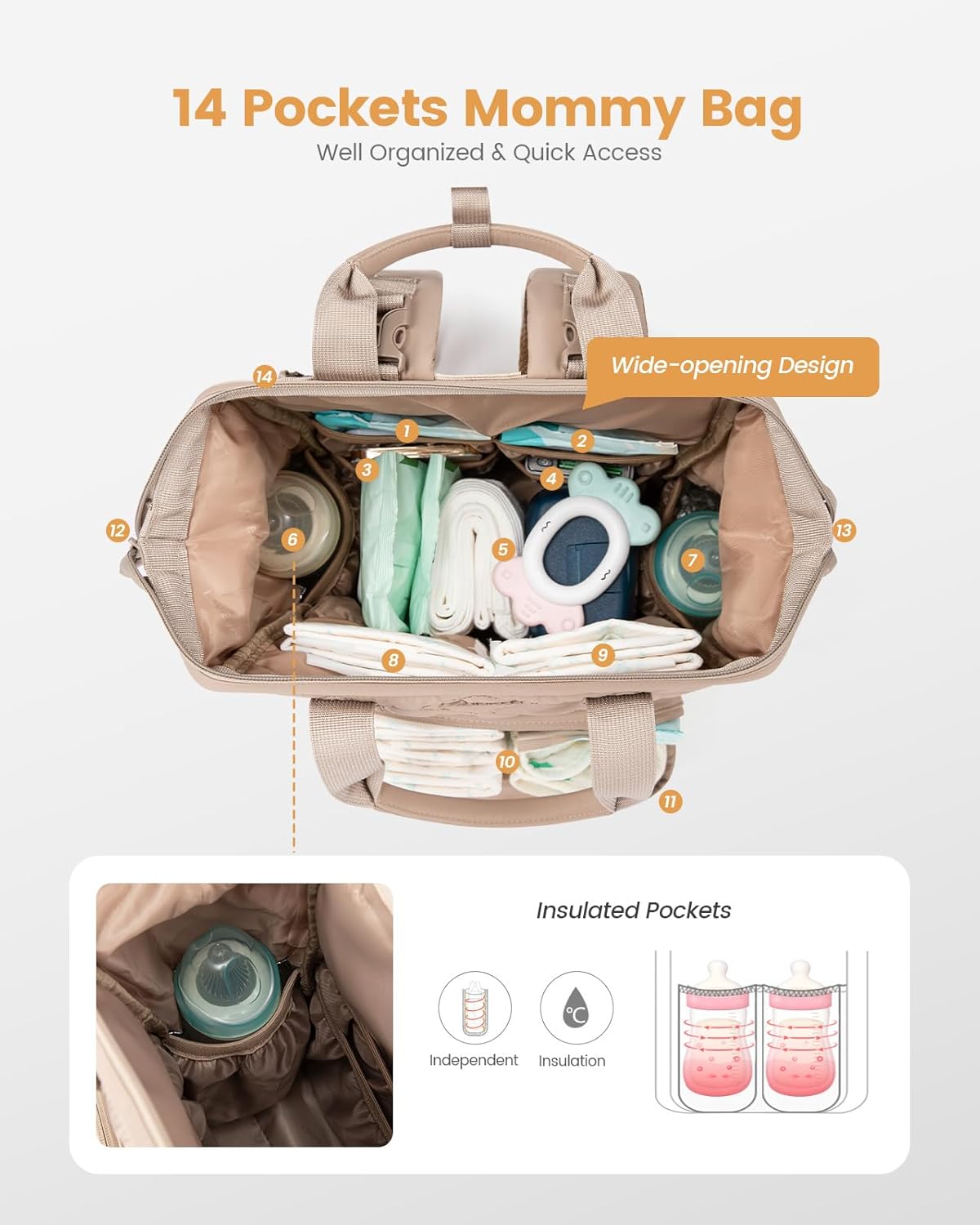 【MULTI-POCKET ORGANIZATION】: With 14 pockets, this baby bag for mom provides suitable space to keep all baby essentials neatly organized. Highlighted features include 2 insulated bottle holders and 1 dedicated wipes dispenser.
