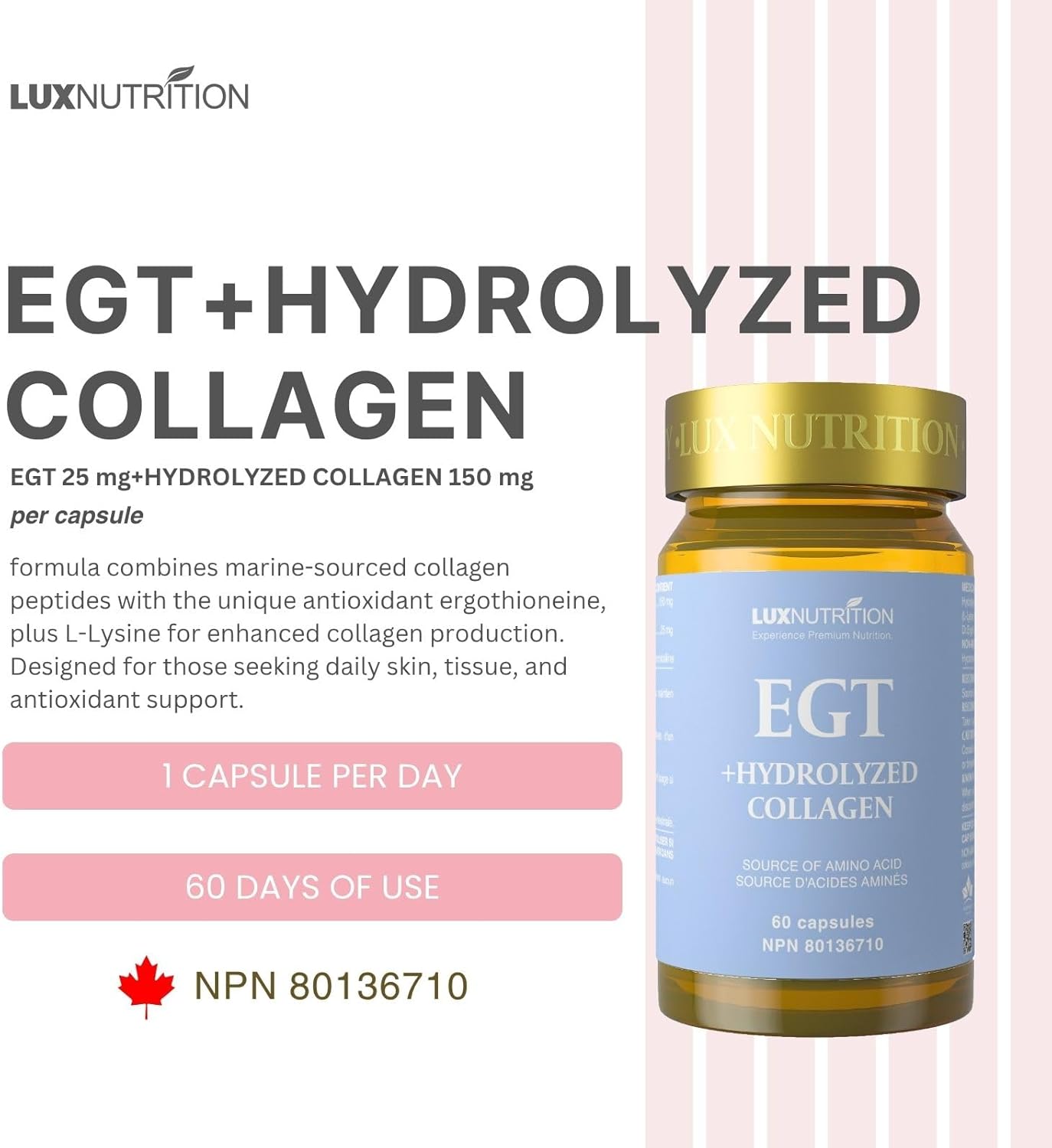 Lux Nutrition EGT + Hydrolyzed Collagen | Patented 99.9% Ergothioneine (GRAS Certified) | Antioxidant & Beauty Support | Youthful Skin, Joint, Bone & Muscle Health | Proudly Made in Canada | 60 Capsules