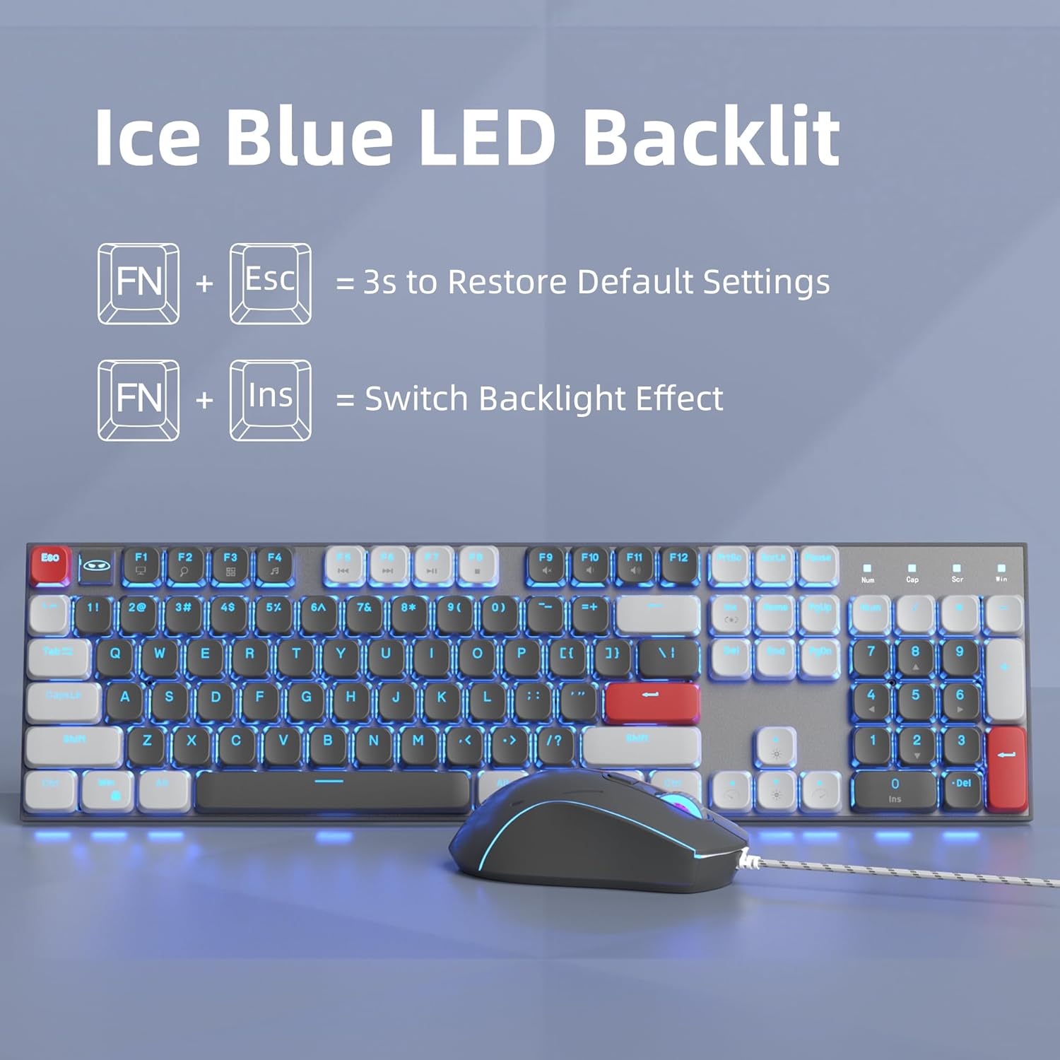 【Ice Blue LED Backlit Keys】MageGee Moon full size light up USB computer Keyboard and mouse set. Ice blue LED backlit keys provide excellent visibility in low-light conditions. Fn+Ins to switch keyboard backlight effect. Mouse is a seven-colour cycle of breathing light, the light with the rhythm of breathing like a star flashing change, customized for your gaming atmosphere lighting effect.