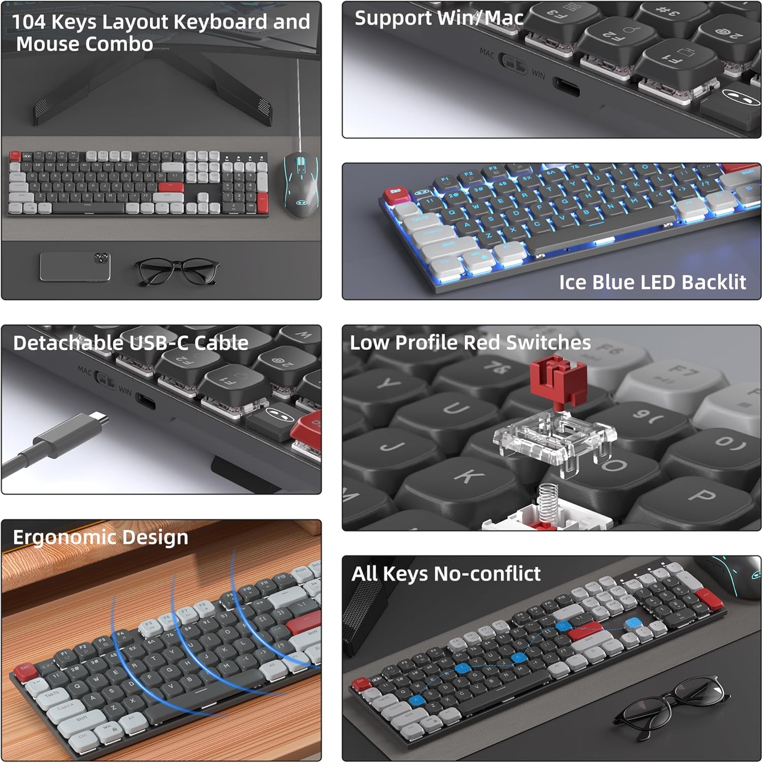 【Quiet and Smooth Keyboard and Mouse Combo】The Moon mechanical keyboard and mouse combo offers a slient click and quick responsive typing experience with its low-profile linear red switches. The included mouse complements the keyboard, providing precise cursor control and quiet smooth navigation. Perfect for both gaming and productivity tasks.