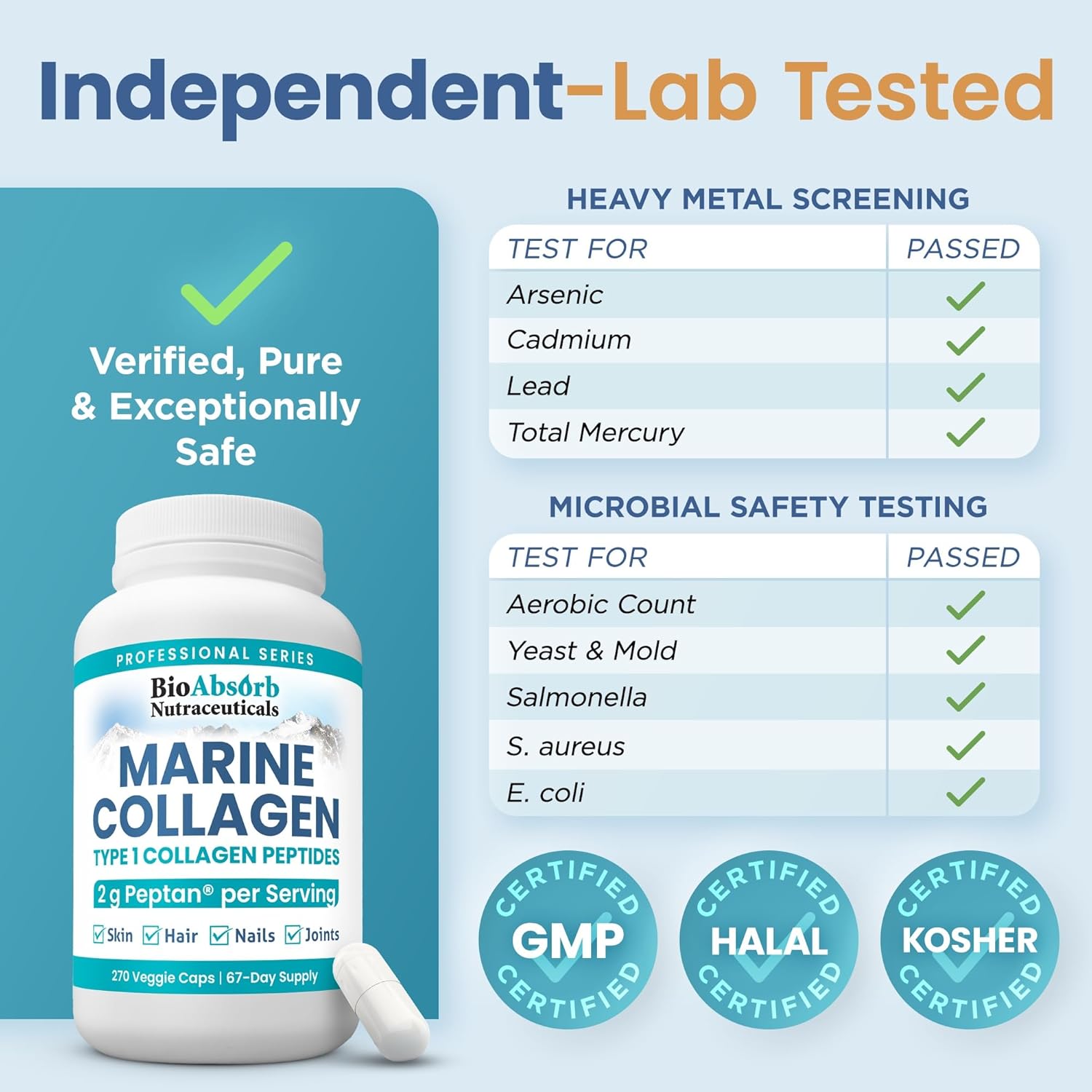 Marine Collagen Capsules. 67-Day Supply. Mercury Free, No Fish Aftertaste. 270 Collagen Pills w/Type 1 Hydrolyzed Collagen Peptides Powder