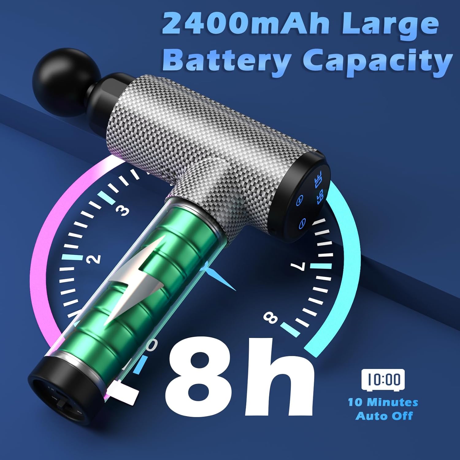 Long Battery life: This handheld massager is equipped with 2400mAh high-quality rechargeable lithium-ion battery, which provides more than 6 hours working time. And it only takes 1.5 to 2 hours to fully charge. With this massage gun, there is no need to worry about having to spend extra time recharging it.