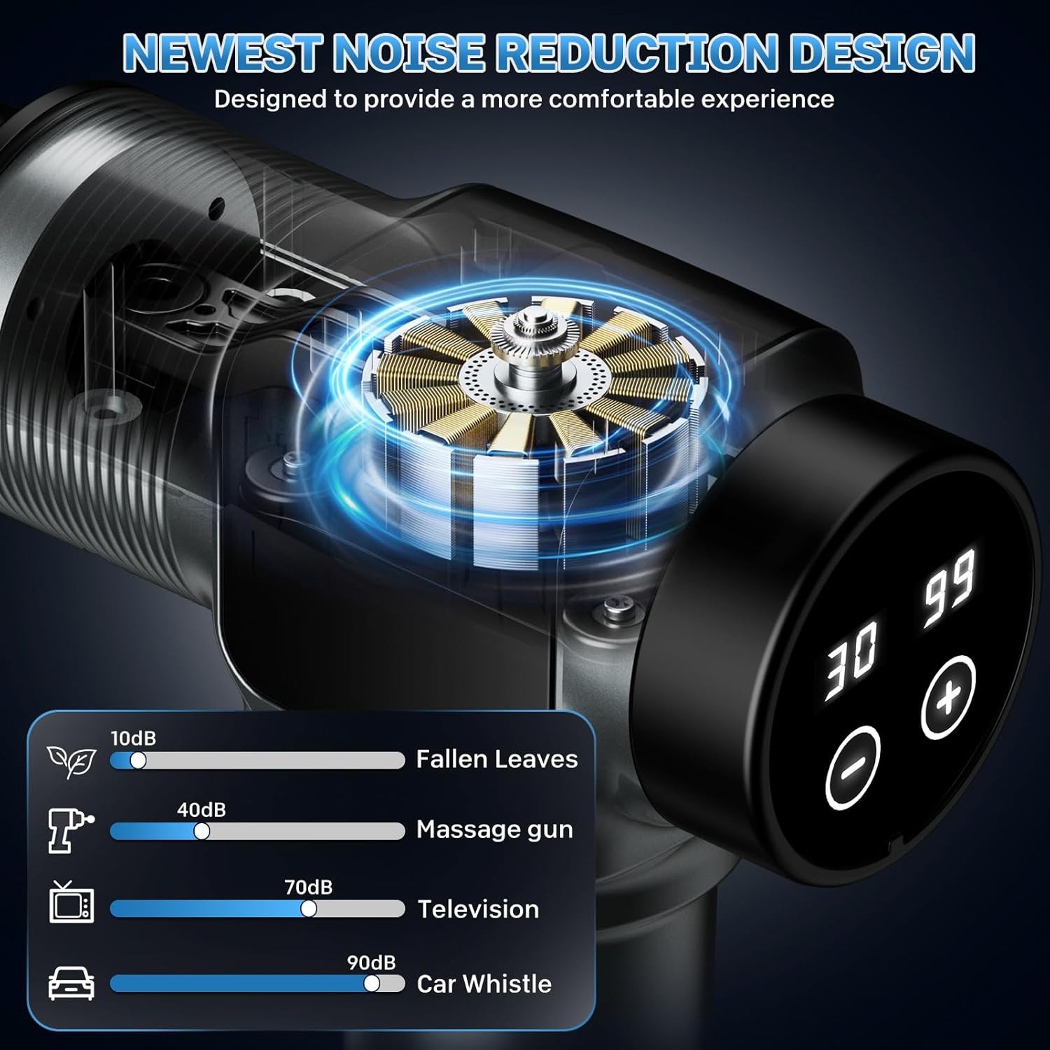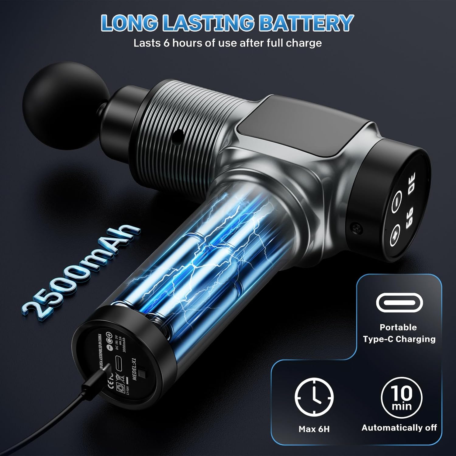 Ergonomic Design & LED Touch Screen: The ergonomic design of muscle massager gun designed to work suitably the body. It can be maximum controlled when you are massaging to focus on the intensity you want to apply. And the handheld massager gun is equipped with an intelligent LED touch screen, which allows you to easily adjust the speed level and view the battery level.