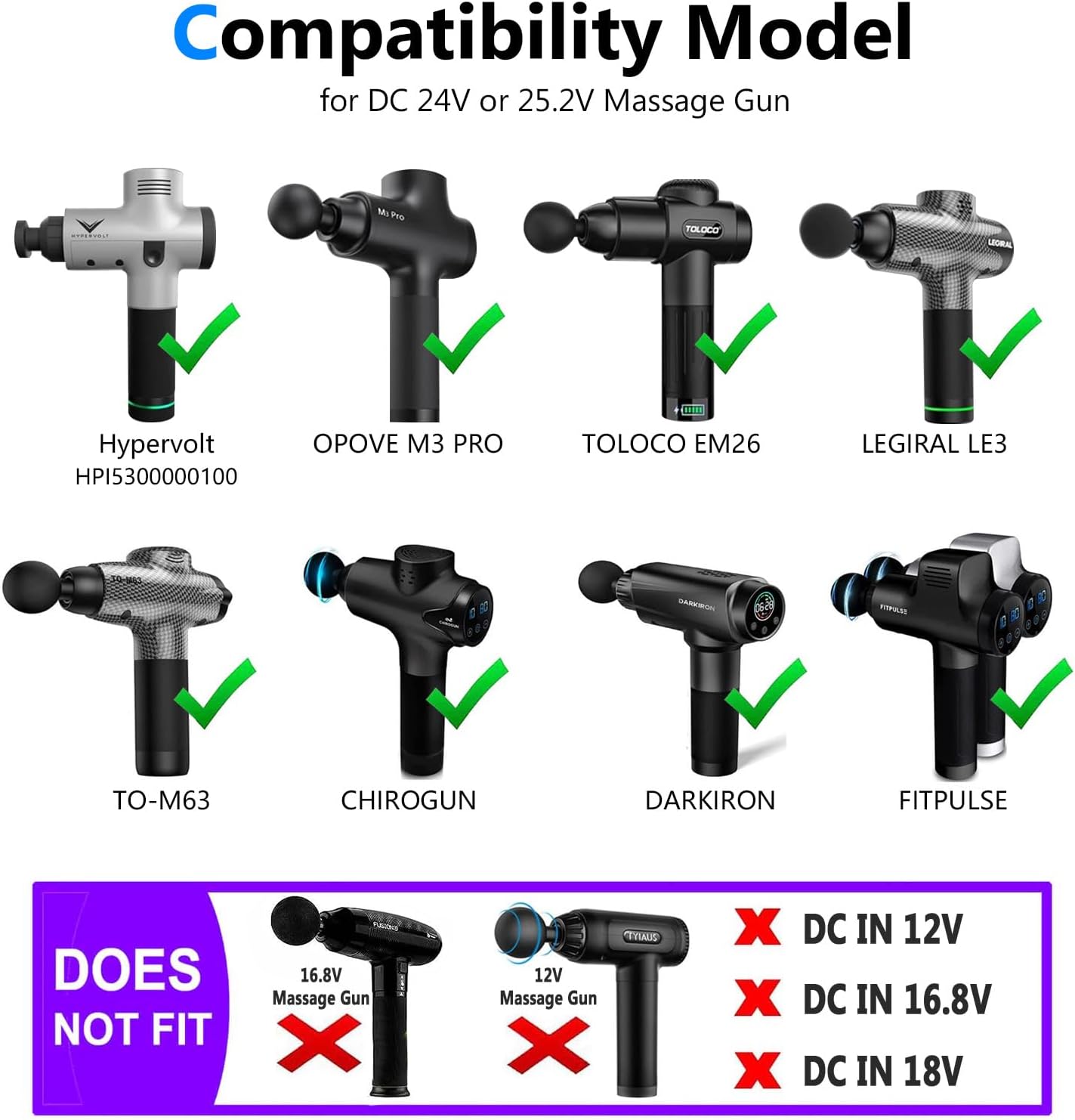 1.【Replaceable Adapter】DC 25.2V 0.8A 1A Adapter Compatible with TOLOCO EM26 T11 Pro TO-M63, FITPULSE, Fusion Black Pro, WhitePro, kamu, hypervolt, Taotronics, Opove m3 pro, Legiral Le3 Le9, Bobbito UM-EM11 UM-EM6 UM-EM9, Hardnex QIQIGO, RENPHO C3 Massage Gun.
