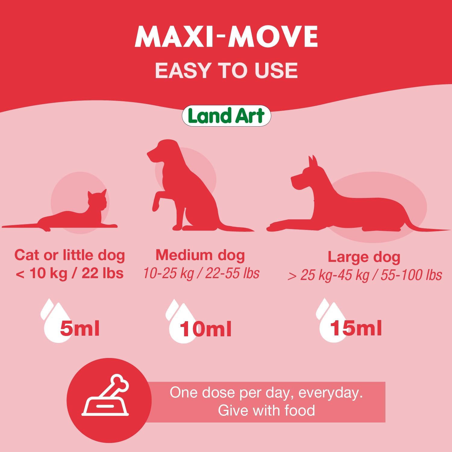 Maxi-Move is a joint supplement for pets. It is a natural formula made with collagen, glucosamine and other ingredients working in synergy to help maintain health and proper functioning of joints. Our bottle contains 240ml, which offers up to 48 doses, thanks to its high potency. This superior, complete, and efficient formula is proudly made in Canada. Contains collagen, glucosamine sulfate, chondroitin, turmeric, hyaluronic acid, devil’s claw and magnesium sulfate. Those ingredients helps to relieve pain, helps for joint mobility and comfort and some are anti-inflammatories and relaxant.