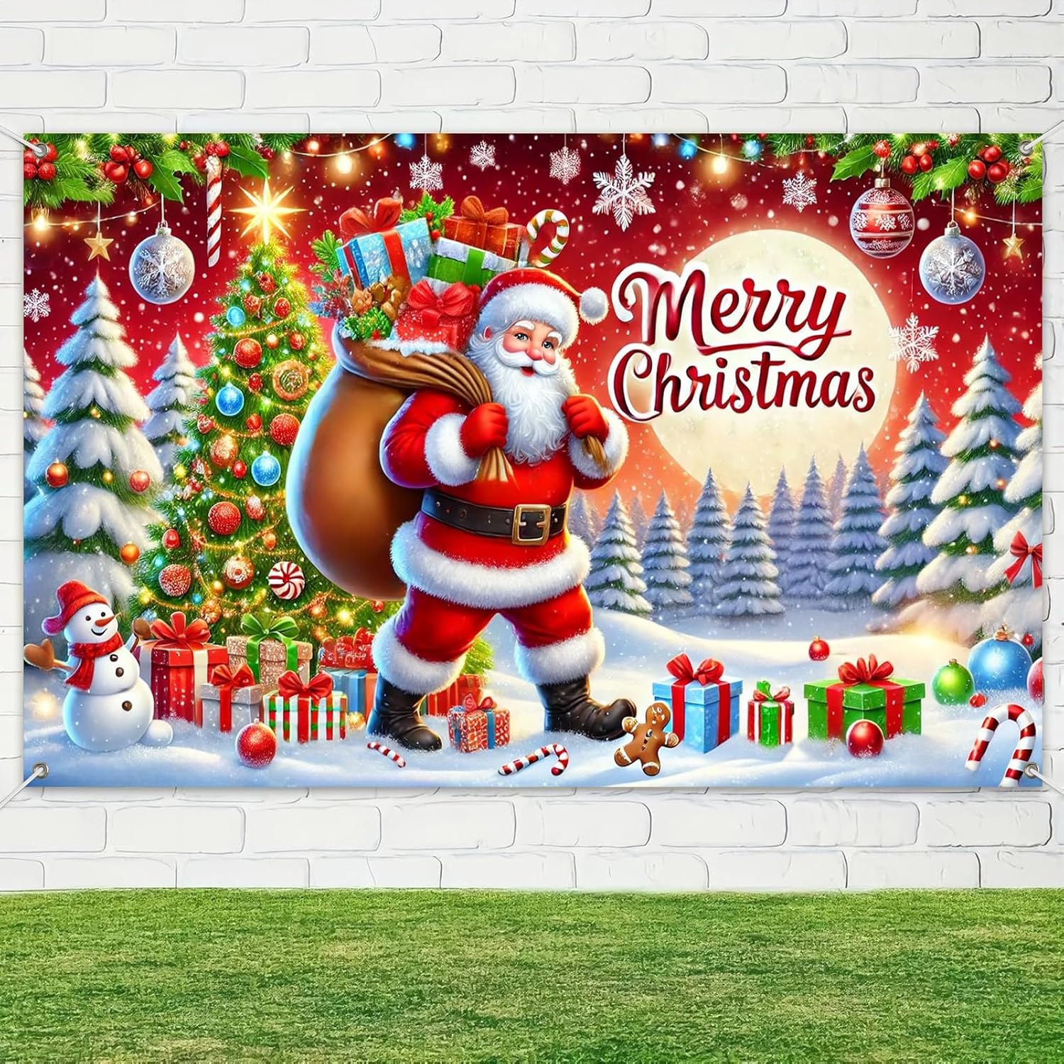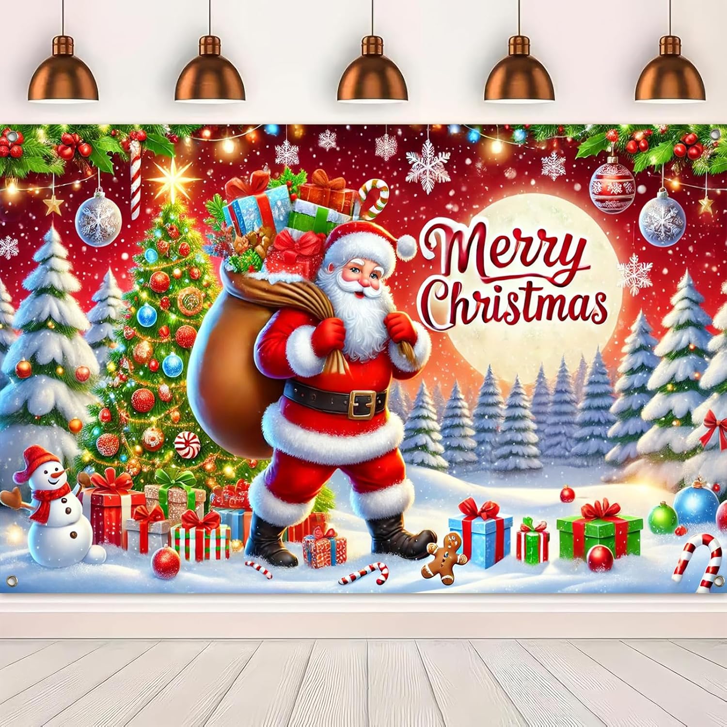 Grand Christmas Scene for Festive Joy: Adorn your space with this magnificent Merry Christmas banner, showcasing a jolly Santa Claus laden with a sack of gifts, standing proudly amidst a beautifully decorated Christmas tree, a cheerful snowman, and an array of presents.