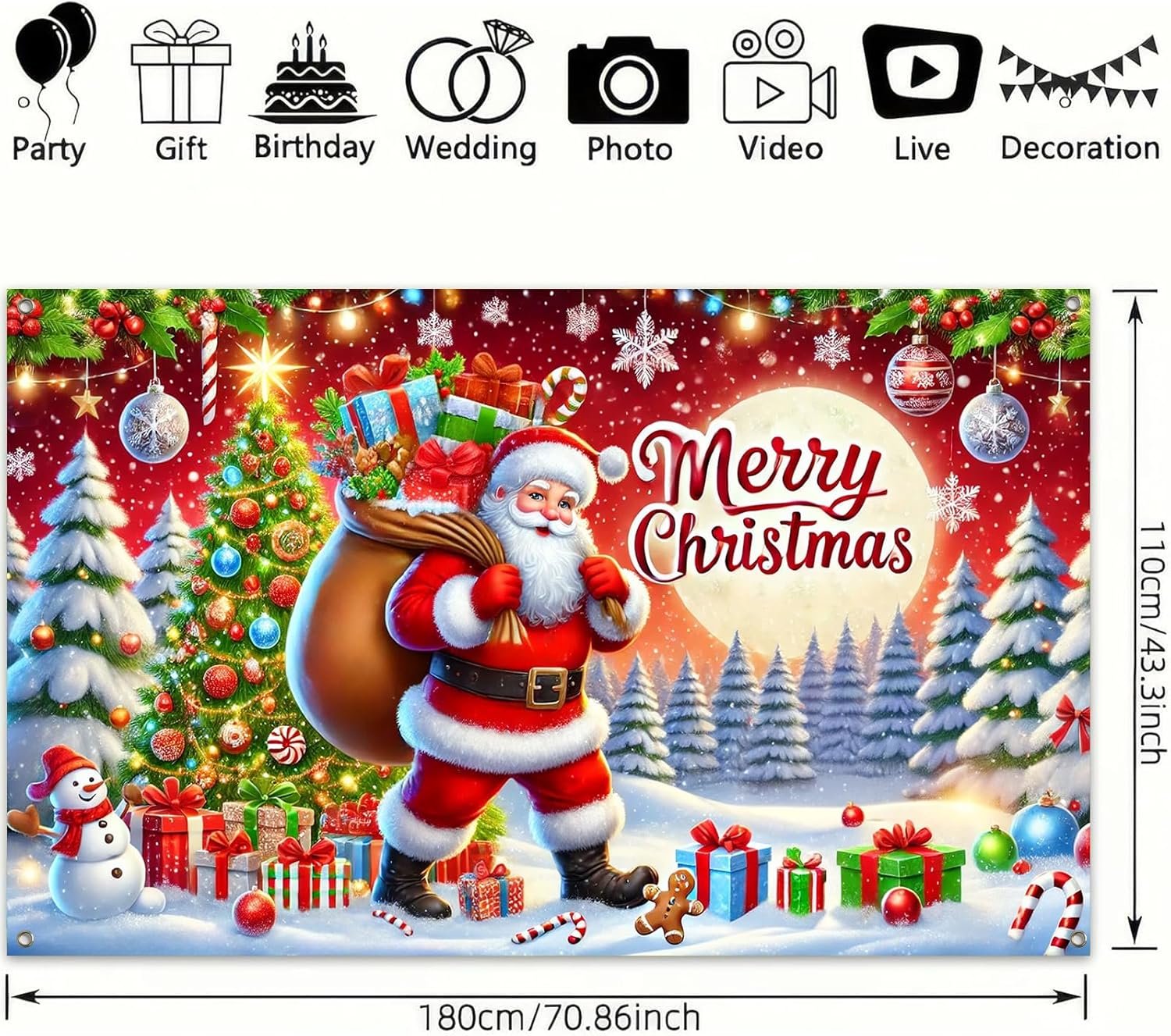 Artful Design for Holiday Spirit: Embellished with beloved Christmas illustrations, including a prominent Santa Claus, a decorated Christmas tree, a happy snowman, and an abundance of gifts, this Merry Christmas banner embodies the genuine spirit of the holiday season.