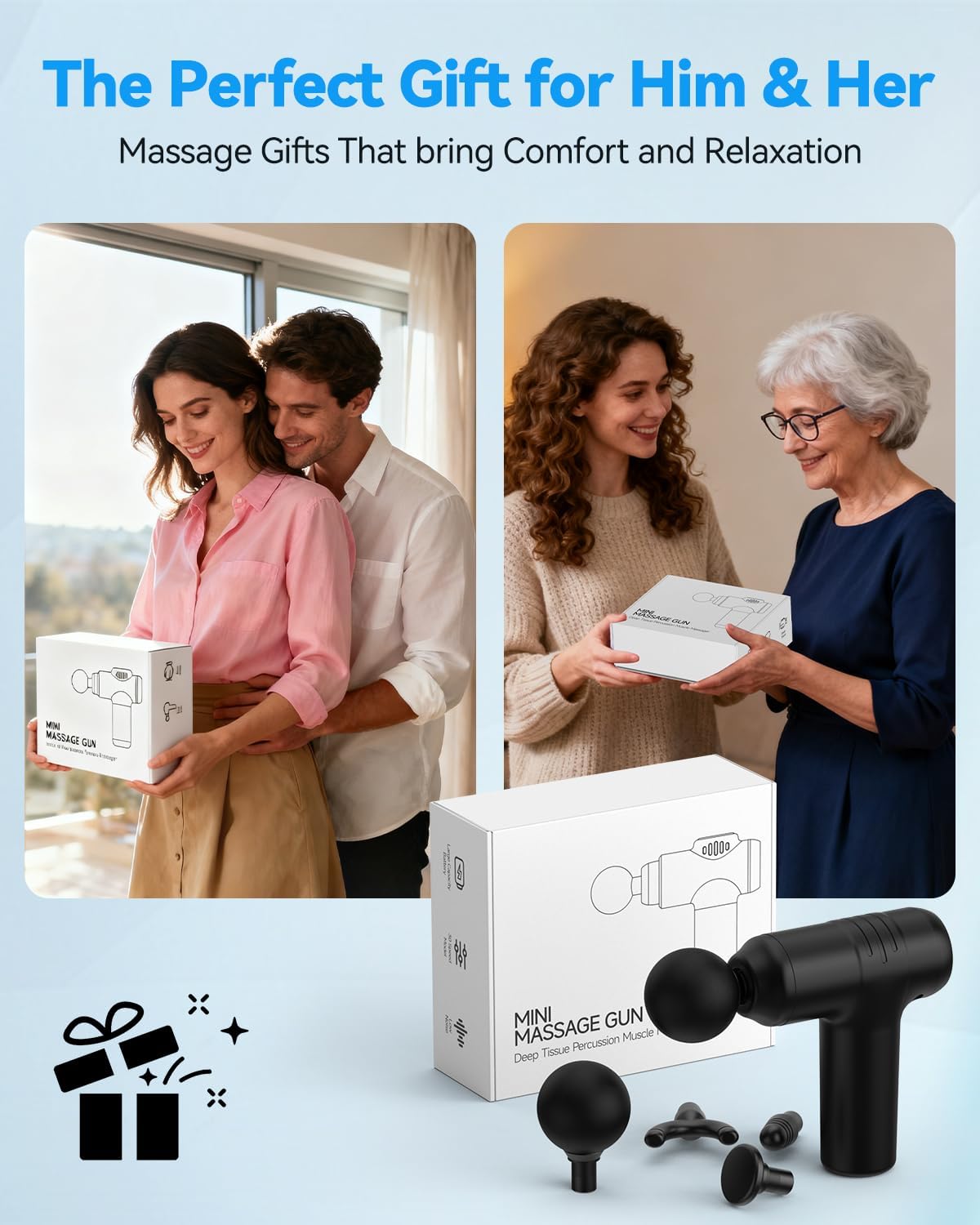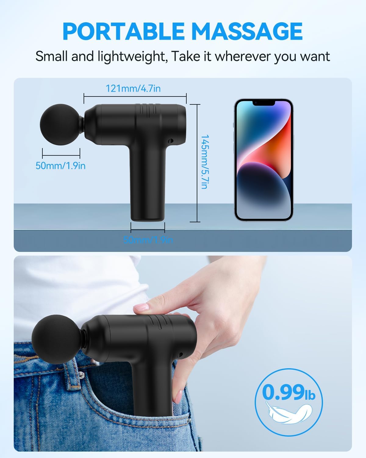 【Pocket Size & Lightweight Mini Massage Gun】Our massage gun with mini size is portable and can be easily put into your handbag or pocket. The massage gun is lightweight at 1.0lb and has a easy handheld design for your convenience anytime, anywhere to get a deep tissue massage at home, traveling, gym exercising, in the office, etc. without causing disturbance. The deep tissue massager gun has a powerful built-in motor and noise reduction technology that brings high power but low noise experience.
