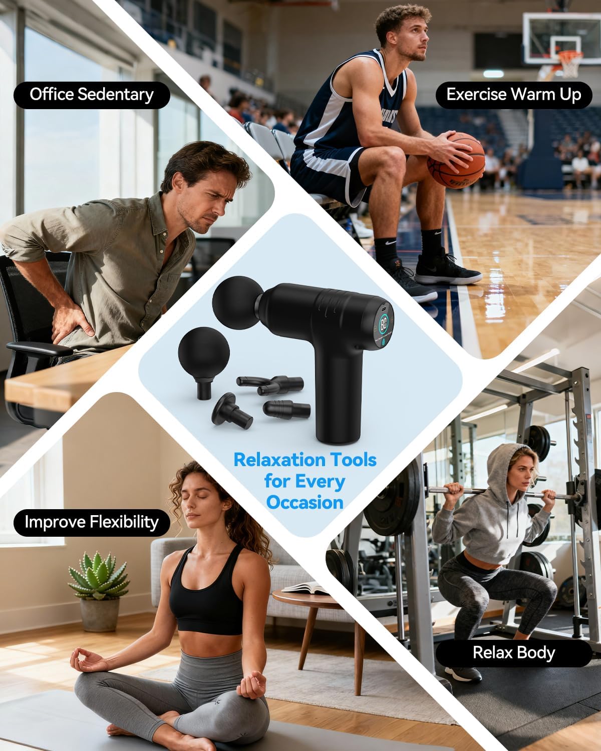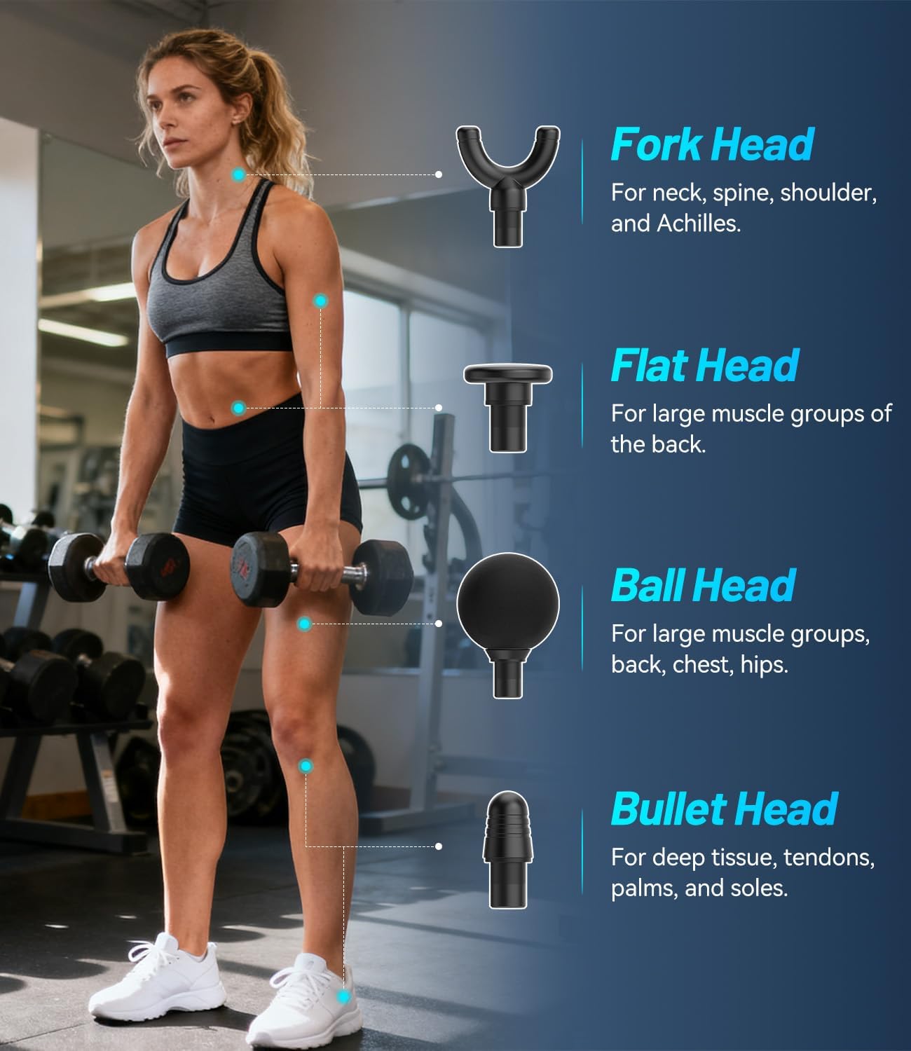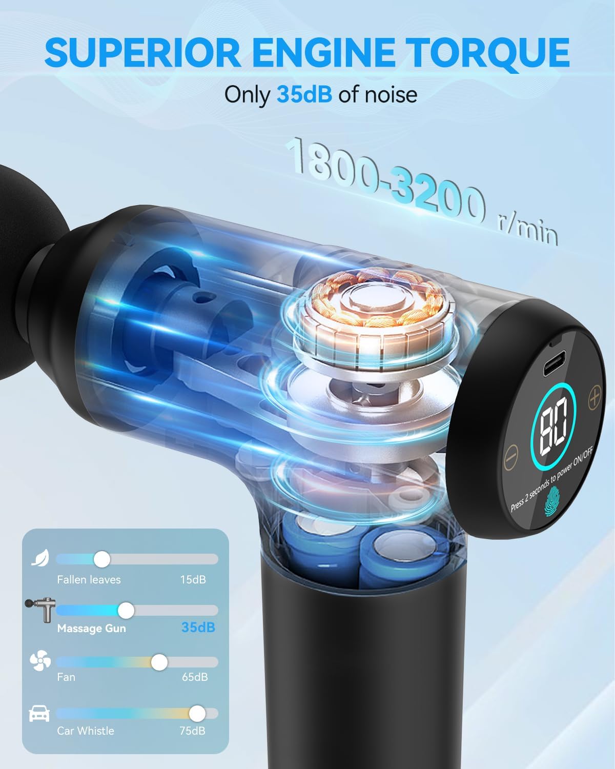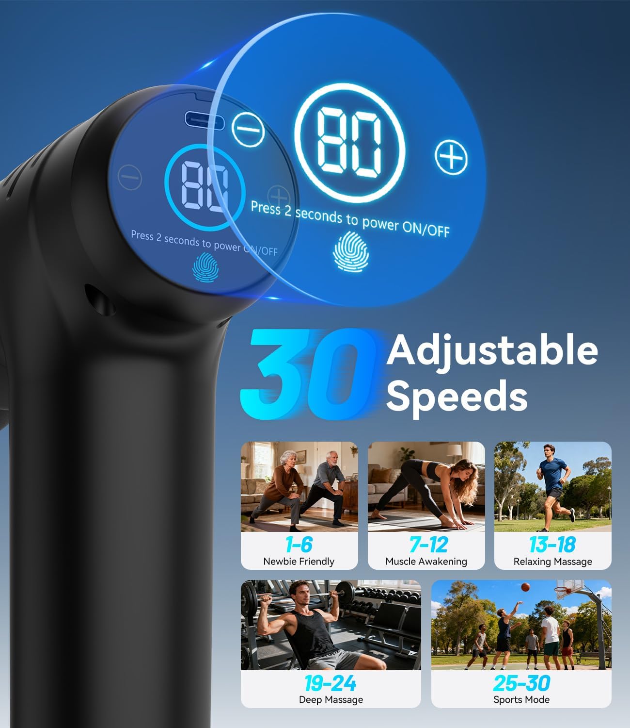 【30 Massage Speeds & 4 Massage Heads】Our massage gun deep tissue offers 30 adjustable vibration modes (vibration frequency from 1200 to 3200 rpm) to meet all your massage needs, providing a more powerful deep penetration massage. 4 different function massage heads to target different body parts and muscle groups, giving you a more comfortable and easy relaxing experience. Suitable for arms, hips, legs, spine, neck, back, achiles tendon, thigh, feet, and other muscle groups.