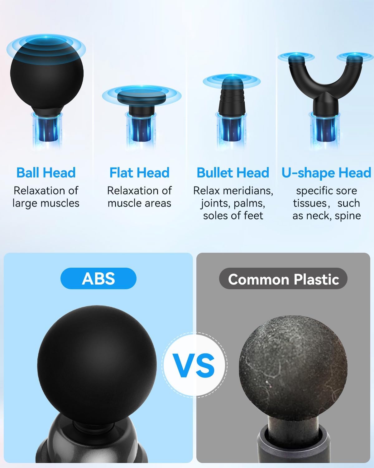 【30 Massage Speeds & 4 Massage Heads】Our massage gun deep tissue offers 30 adjustable vibration modes (vibration frequency from 1200 to 3200 rpm) to meet all your massage needs, providing a more powerful deep penetration massage. 4 different function massage heads to target different body parts and muscle groups, giving you a more comfortable and easy relaxing experience. Suitable for arms, hips, legs, spine, neck, back, achiles tendon, thigh, feet, and other muscle groups.