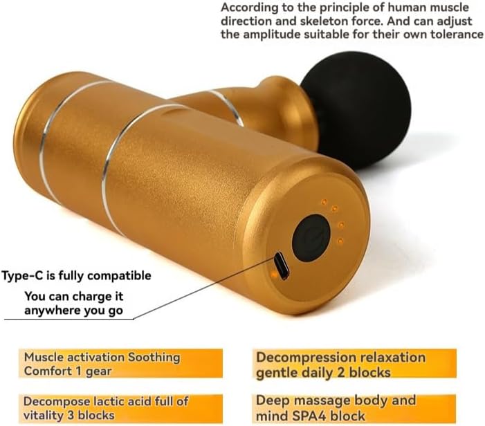 Experience deep muscle relief with this sleek, portable mini massage gun in elegant rose gold. This compact yet powerful fascia gun delivers targeted vibration therapy to help soothe tired muscles and enhance recovery after workouts. Its ergonomic design features a comfortable grip and easy-to-use controls, making it perfect for on-the-go muscle relaxation. The portable size allows you to carry it in your gym bag or travel luggage without taking up much space. Ideal for athletes, fitness enthusiasts, or anyone seeking quick muscle tension relief, this handheld massager offers convenient access to percussion therapy whenever you need it. The stylish rose gold finish adds a touch of sophistication to this practical fitness tool. Use it before workouts to warm up muscles or after exercise to aid in recovery and relaxation. The versatile design makes it suitable for targeting various muscle groups.