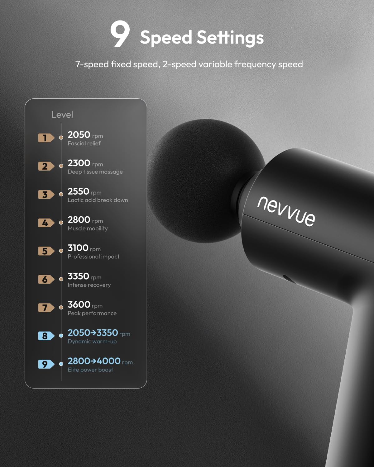 7+2 Speed Level Customization: Tailor your recovery with 7 fixed speed levels and 2 variable frequency options. The Nevvue mini massage gun packs a powerful punch, offering versatile intensity settings for effective relief