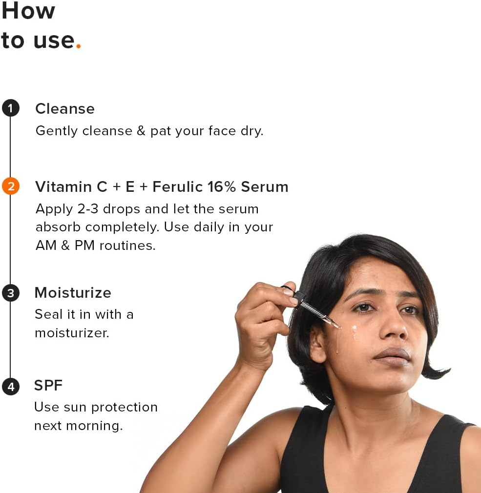 [ HOW & WHEN TO USE ]: After cleansing and toning your face, take 2-3 drops of Vitamin C serum on your fingertips with the dropper. Apply it on the face by gently tapping it on the skin. With a circular motion, evenly spread the serum and allow your skin to absorb it. When to use: AM & PM Everyday.