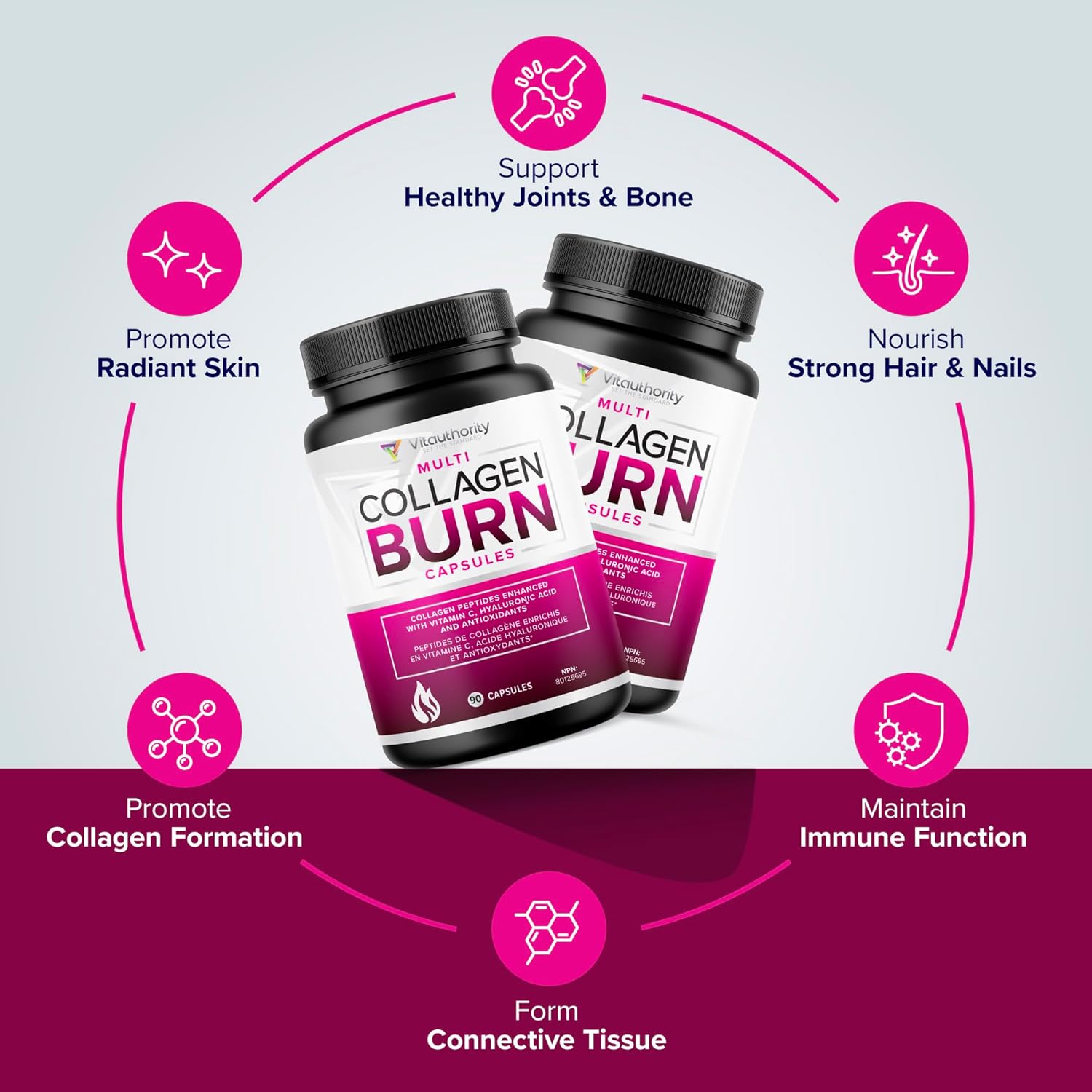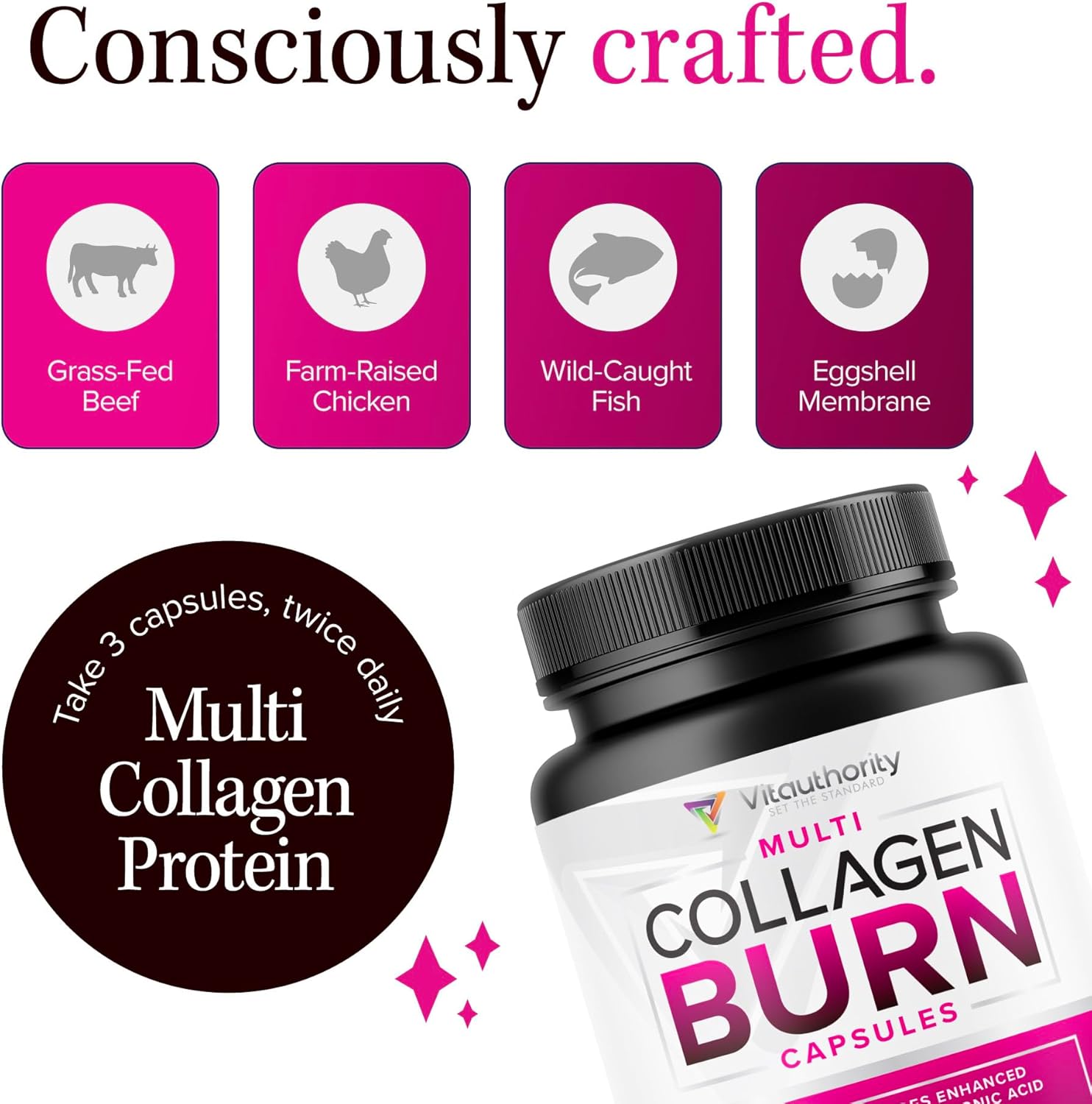 Multi Collagen Burn: Multi-Type Hydrolyzed Protein Peptides with Hyaluronic Acid, Vitamin C, SOD B Dimpless, Types I, II, III, V and X Collagen, Caffeine-Free (Unflavored Capsules)