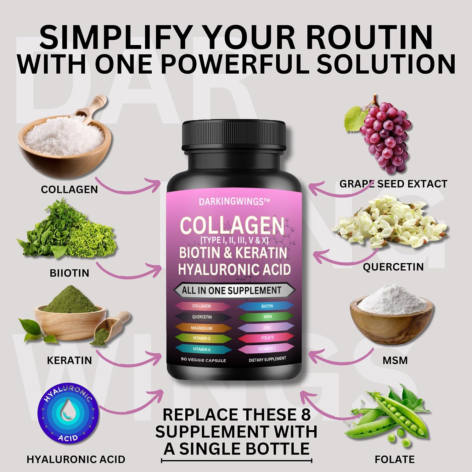 Packed with a potent blend of Collagen with Hyaluronic Acid, Biotin, Keratin, Magnesium, Zinc, Quercetin, Grape Seed Extract, it offers an abundance of mineral and vitamin benefits. Say goodbye to the clutter of countless supplements in your cabinet and make room for a single solution. Darkingwings presents a groundbreaking 14-in-1 beauty formula, combining collagen biotin, keratin, hyaluronic acid, with several other minerals and vitamins.